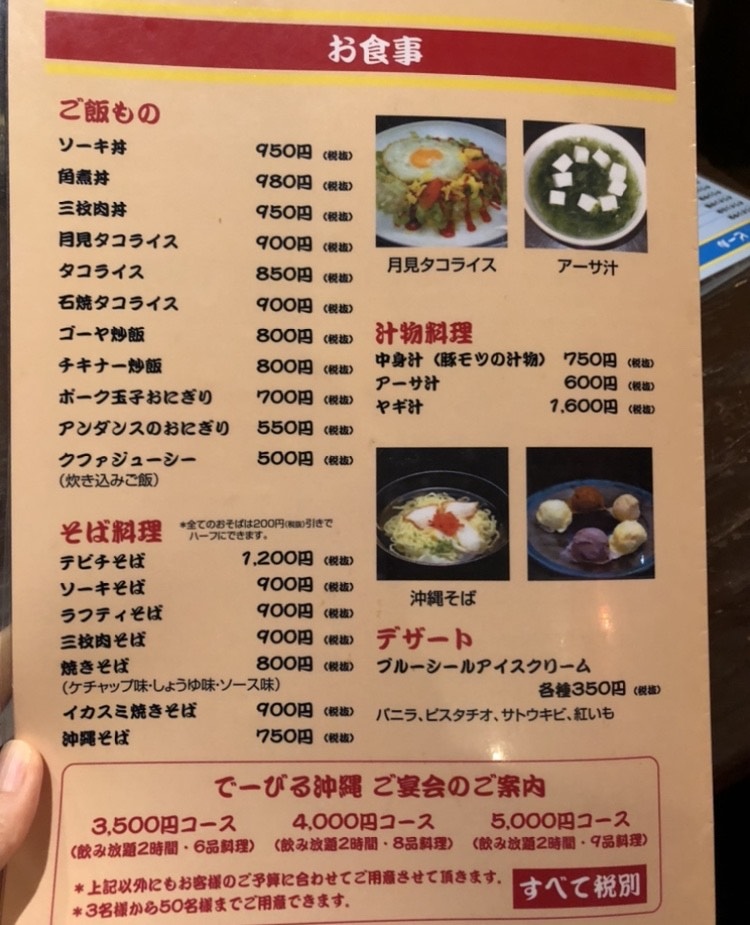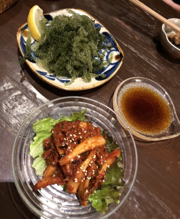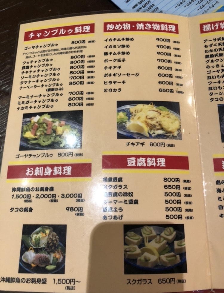 ゴーヤチャンプルは800円で、メニュー表の写真より実際のほうが量が多いです。しかも提供されるまでの時間が早い。ソーキソバは900円。紅生姜は別添えで出してくれます。ノーマルの島らっきょうが品切れとのことで、キムチらっきょうを頂きましたがなかなかの辛さでした。