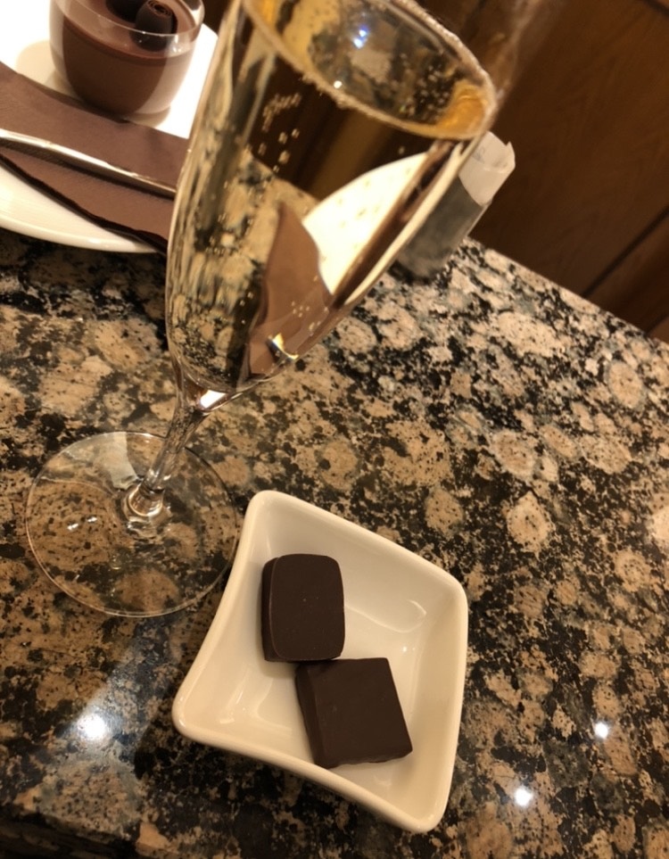 奥のイートインのカウンター席は計6席しかありませんが、先客は3名のみだったので、私は店内でホットチョコレートとチョコレートムース、夫はアルコールとショコラのセットを頂きました。