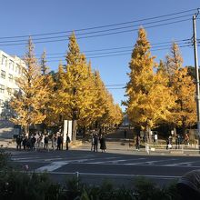 東急東横線日吉駅東口を出てすぐです。入口から構内に向かって銀杏並木が200mほど続いていて、関係者で無くても自由に散策できます。12月上旬に訪問しましたが、綺麗に黄色く紅葉していて、ちょうど見頃でした。