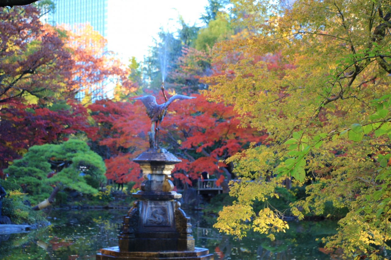 12月4日に日比谷公園に行った際、雲形池の真ん中に設置されている鶴の噴水を見てきました。丁度周辺のイチョウやもみじが綺麗に黄葉・紅葉していたので、鶴の噴水のバックに紅葉・黄葉が見られて良い景観となっていました。また、雲形池のアクセントにもなっていて良かったです。