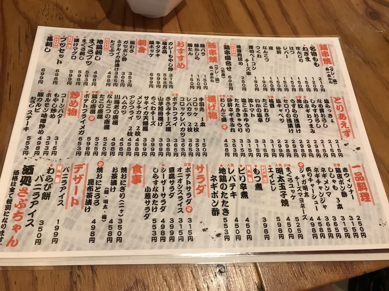 駅から4分くらい。メインの通りから線路側に入る。12月の土曜の6時前、どこならお店もすでにいっぱいのなか、空席があったさぶちゃんに入店。空席の理由は料理もフロアも一人で回していました!!というか、まわんない(苦笑)