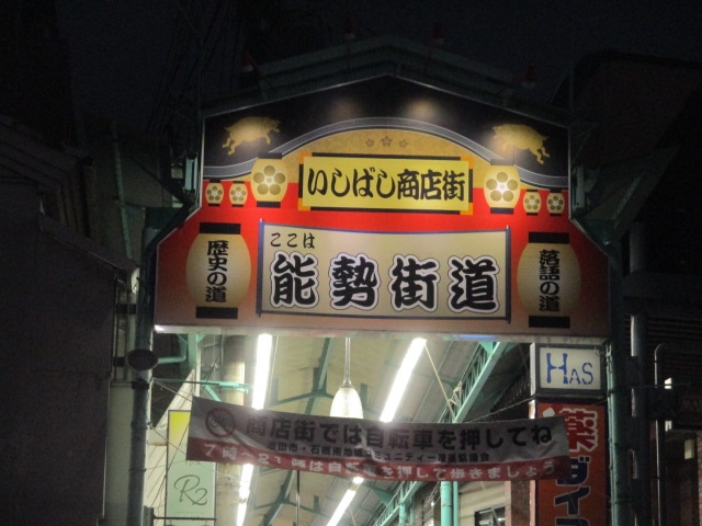 一口に能勢街道と言っても範囲が広くどこだろうと思っていましたが、明確な場所があります。いしばし商店街の入り口の上に「ここは能勢街道」というカラフルな大きな看板が掛かっていました。「歴史の道」とも書いてありました。商店街を通っているとは意外ですね。