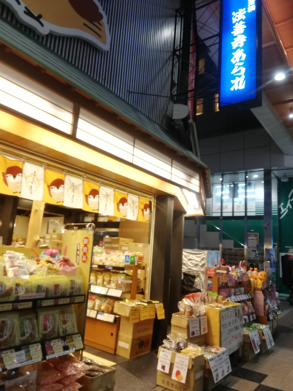 心斎橋筋商店街にあります。商品は100円からあるので、ばらまき土産に良いと思います。季節ものかもしれませんが、チョコレートの扱いもありました。私は「宝箱」550円を買いました!クレジットカード使用可能。電子マネー不可。キャッシュレス5%還元店。