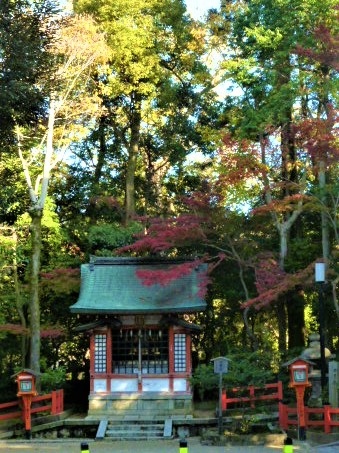 八坂神社の境内<社>で本殿の奥に[日吉社]がありました。勝手な思い込みで秀吉公が晩年ゆかり地元だから(幼名)日吉丸;小さいときは`日吉`;を、で 日吉大社から<末社>として建立したと! 勘違いでした;古事記に記載されている大国主神ゆかりの神社…本殿の奥;東北の方角に建ってい八坂神社の鬼門を守っているでした♪ お宮は朱色の堂と柵/石段もあり小柄ながら境内の神社で、直ぐ側の紅葉が掛かっていました。なお、秀吉公は日吉関連社に復興に尽力したようです。
