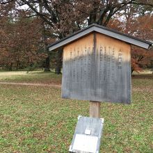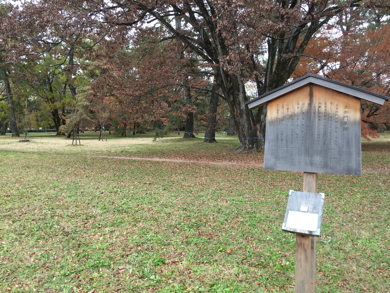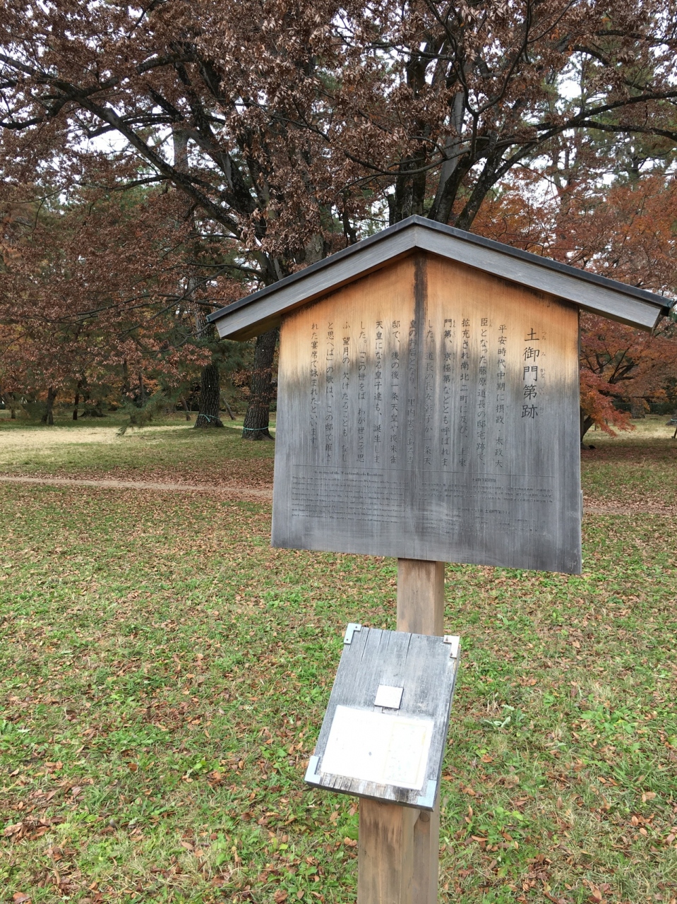 平安時代中期の藤原道長邸宅跡ですが、建物はなく木の看板があるだけで、広場のようになっていて、細長い木が至る所に立っていました。広い敷地でこの場所で宴席も行われたとのことですが、広いので藤原道長邸があったと納得出来る場所でした。