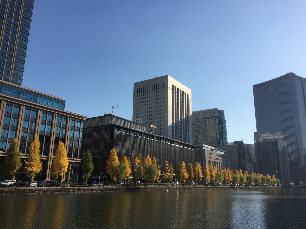 東京駅側から皇居へ向かうとまず初めに外苑があり、外堀や由緒ある門を見ることができます。マラソンや散歩をしている人も多く、オフィス街の憩いの場的な感じがします。外苑側から丸の内側を見ると外堀と高層ビルや紅葉した街路樹などが見えとてもきれいでした。