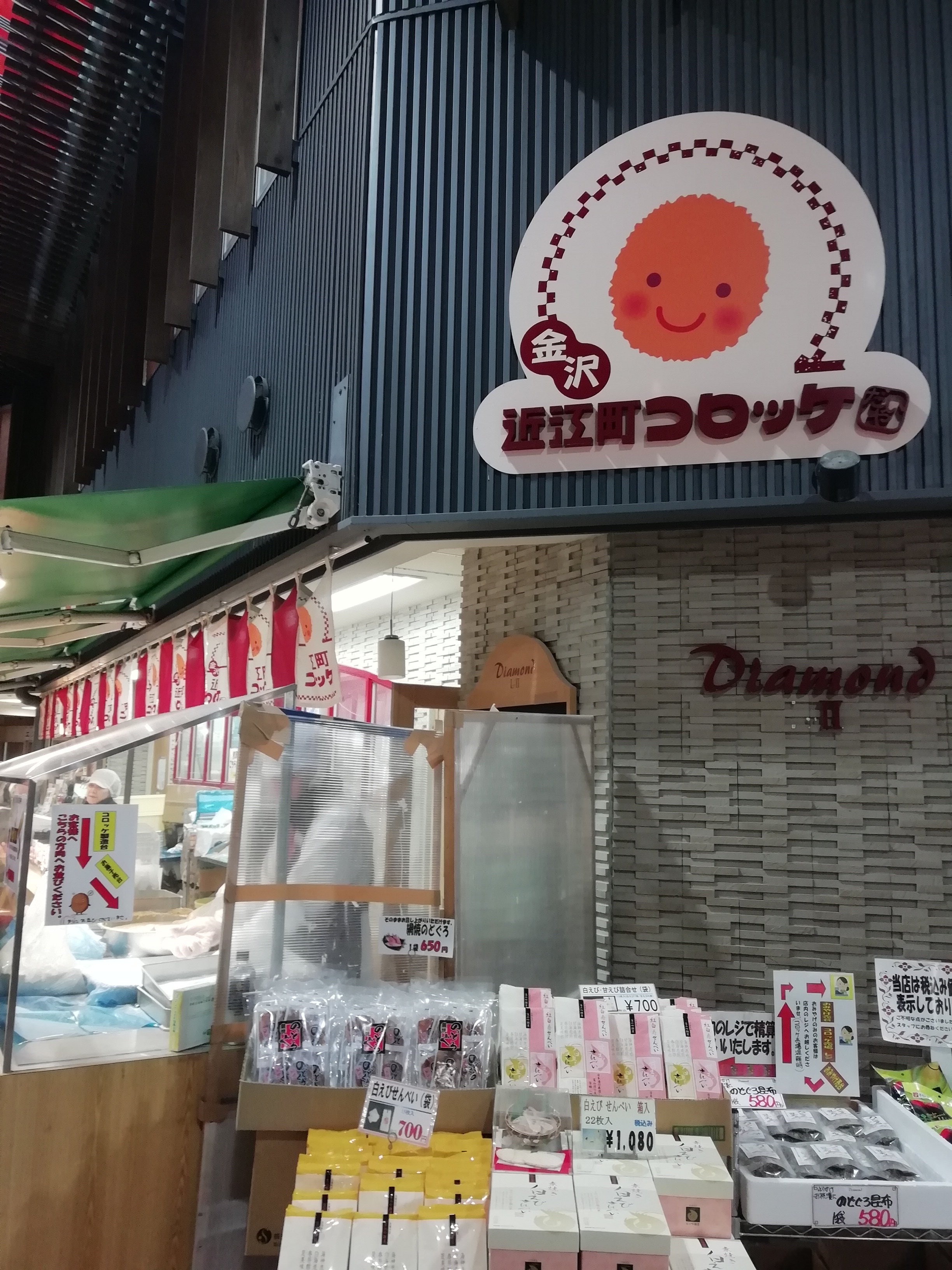 JR金沢駅の兼六園口から徒歩で15分、近江町市場内にあるダイヤモンドです。市場内に2ケ所あり、1軒は食品スーパーのような店で、もう一つの店舗では近江町コロッケなるものが売られてました。結構、人気のコロッケのようで食べ歩き出来るので是非。