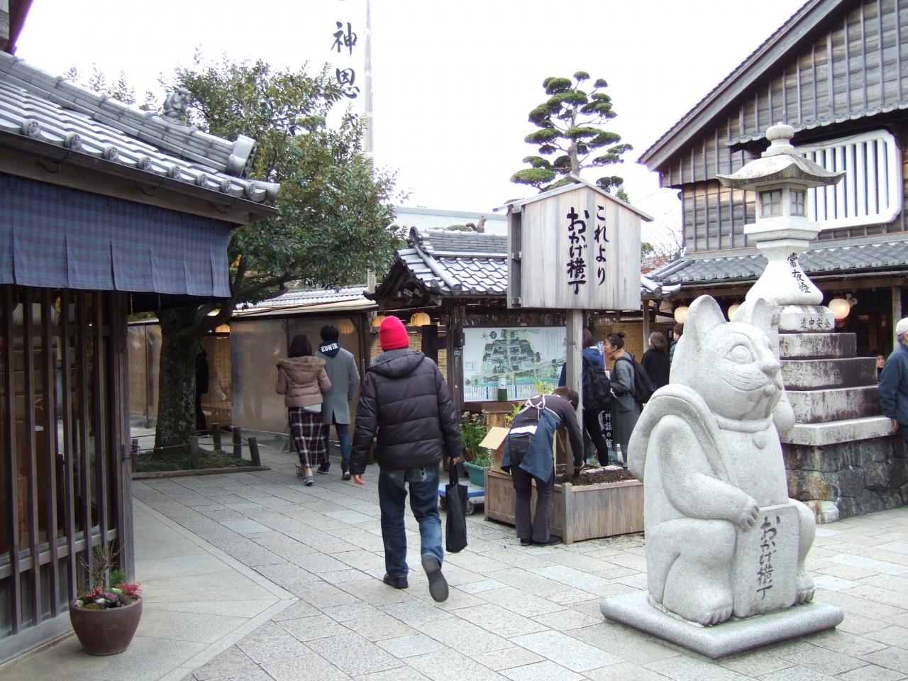 伊勢神宮の内宮を出て、おはらい町をしばらく歩くと左側におかげ横丁の入り口があります。中は江戸時代を再現したテーマパーク的な感じで、食事処やお土産屋さんなど、いろいろなお店があります。いつも賑わっていますが、食事も買い物もここで済ませられるのは便利です。