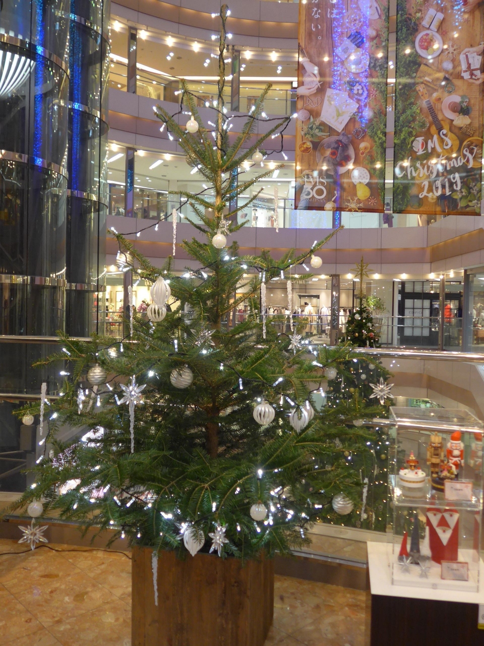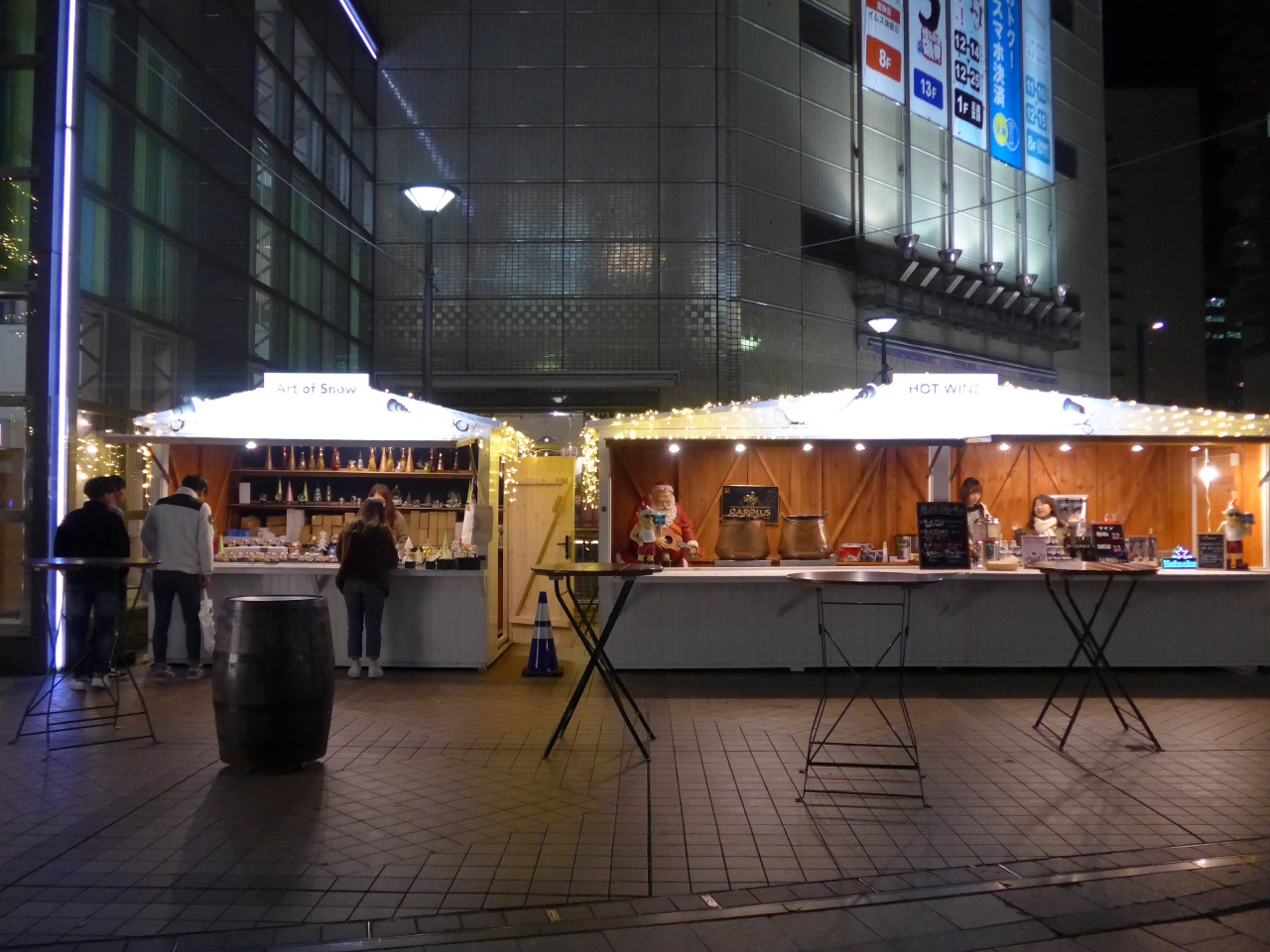 ビルの入り口外のクリスマスマーケット、入り口付近のクリスマスツリーと