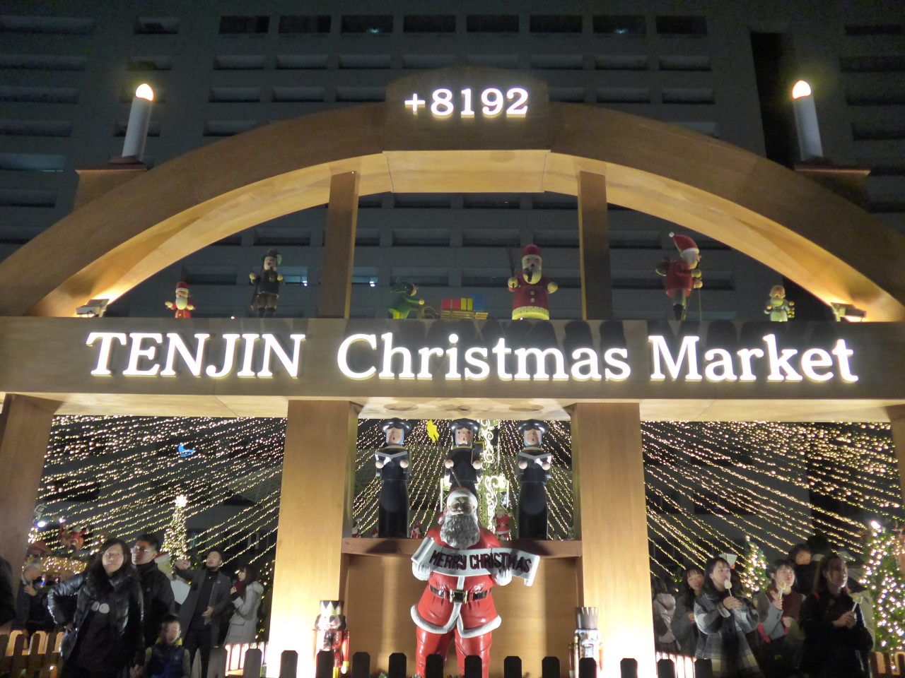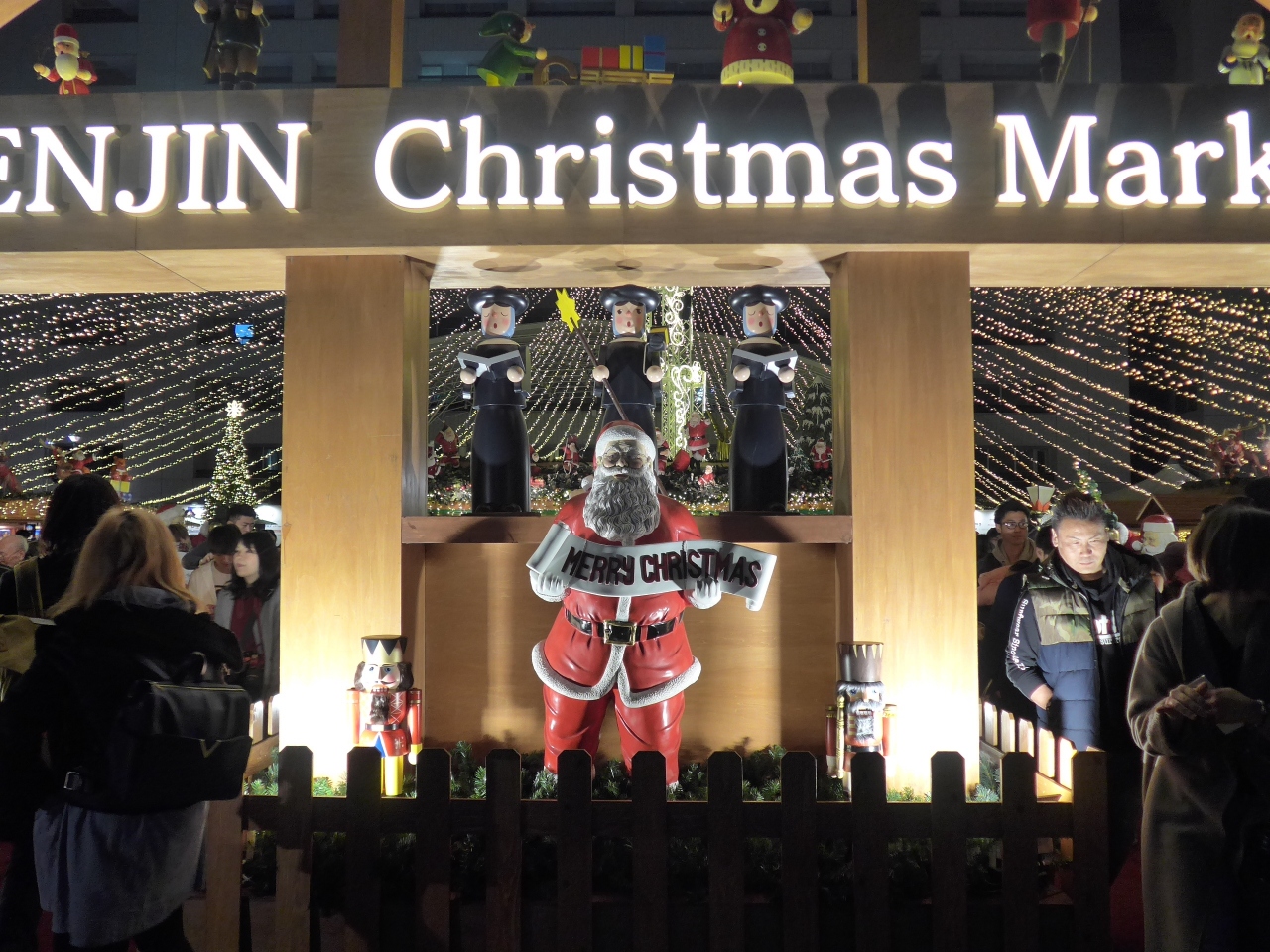 福岡一のショッピングの街天神の中心にある福岡市役所、その西側に位置するふれあい広場で今年も天神クリスマスマーケットが開催されていて日曜日の夜にもかかわらず多くの観光客が訪れて見物、飲食をしていました。