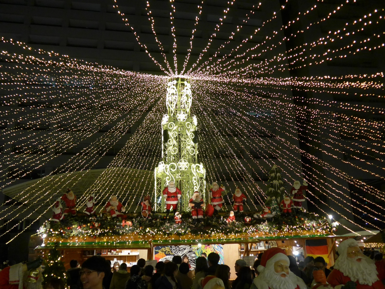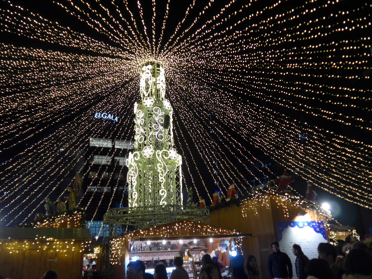 屋根の様に広がるイルミネーションが見事に会場を照らし会場内の飲食店で販売されている料理と飲み物をテーブル席に移動し食している人々が沢山でした。