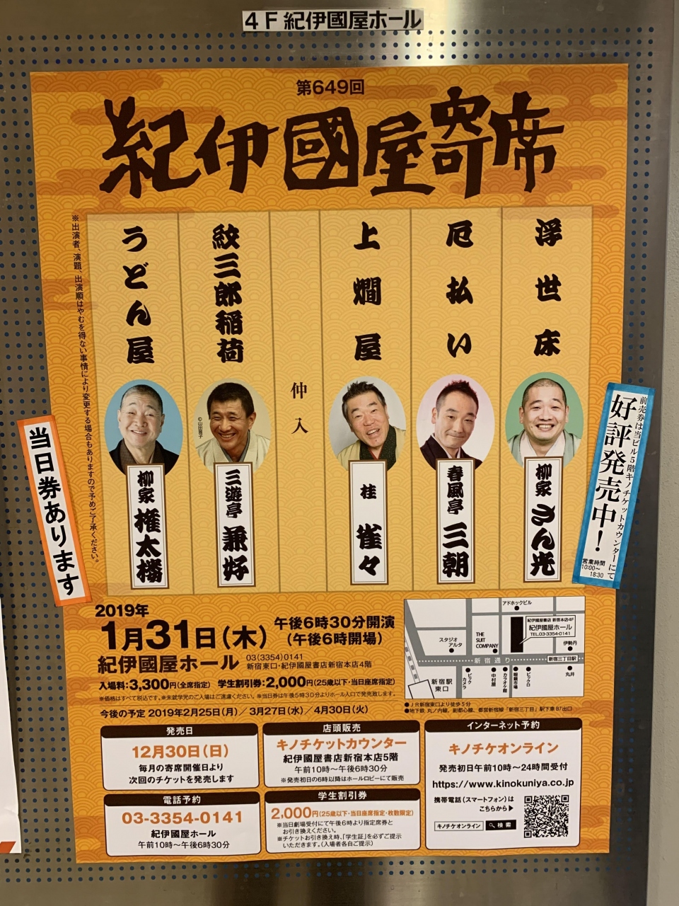 鑑賞する演芸の会場が「紀伊國屋ホール」と書いてあったので、てっきり新宿南口にある「紀伊國屋サザンシアター」のことかと勘違いしていました。「紀伊國屋ホール」は、紀伊国屋ビル内にある劇場で、サザンシアターとちがい、劇場内の雰囲気や座席などは歴史を感じさせる劇場でした。