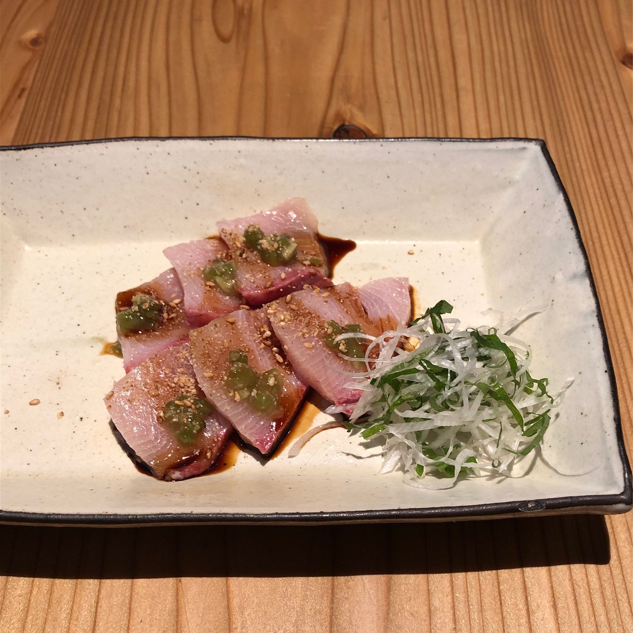 夜に来るのは初めてで、美味しそうな日本酒とアテに鰤のお刺身も注文しました。