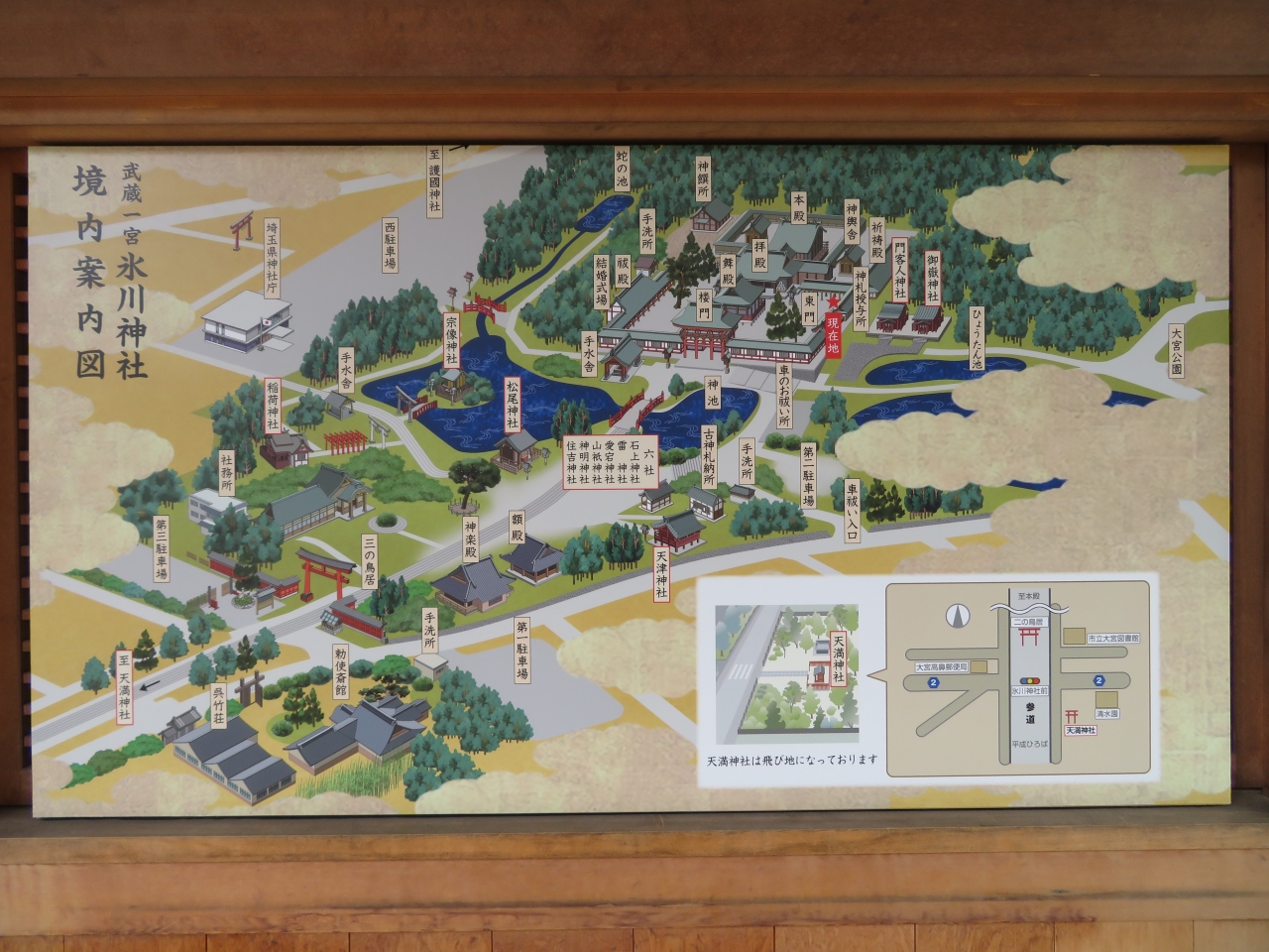 東武野田線(アーバンパークライン)北大宮駅から歩いて10分くらい。JR大宮駅東口からだと歩いて15分くらい。御祭神は、須佐之男命(すさのおのみこと)、稲田姫命(いなだひめのみこと)、大己貴命(おおなむちのみこと)の3柱が祀られている。2000年以上の歴史を持つといわれ、大宮という地名の元ともなっているそうだ。「JRさいたま新都心駅」付近から2キロにわたる長い参道があり、ケヤキを中心とした並木が続いていて、その間に三つの大鳥居がある。境内は広く、摂社がたくさんあった。時間のゆとりをもっていった方がいい。