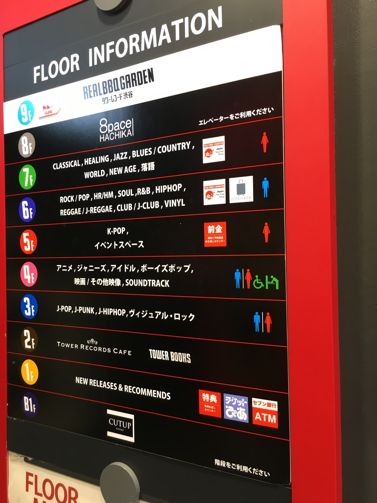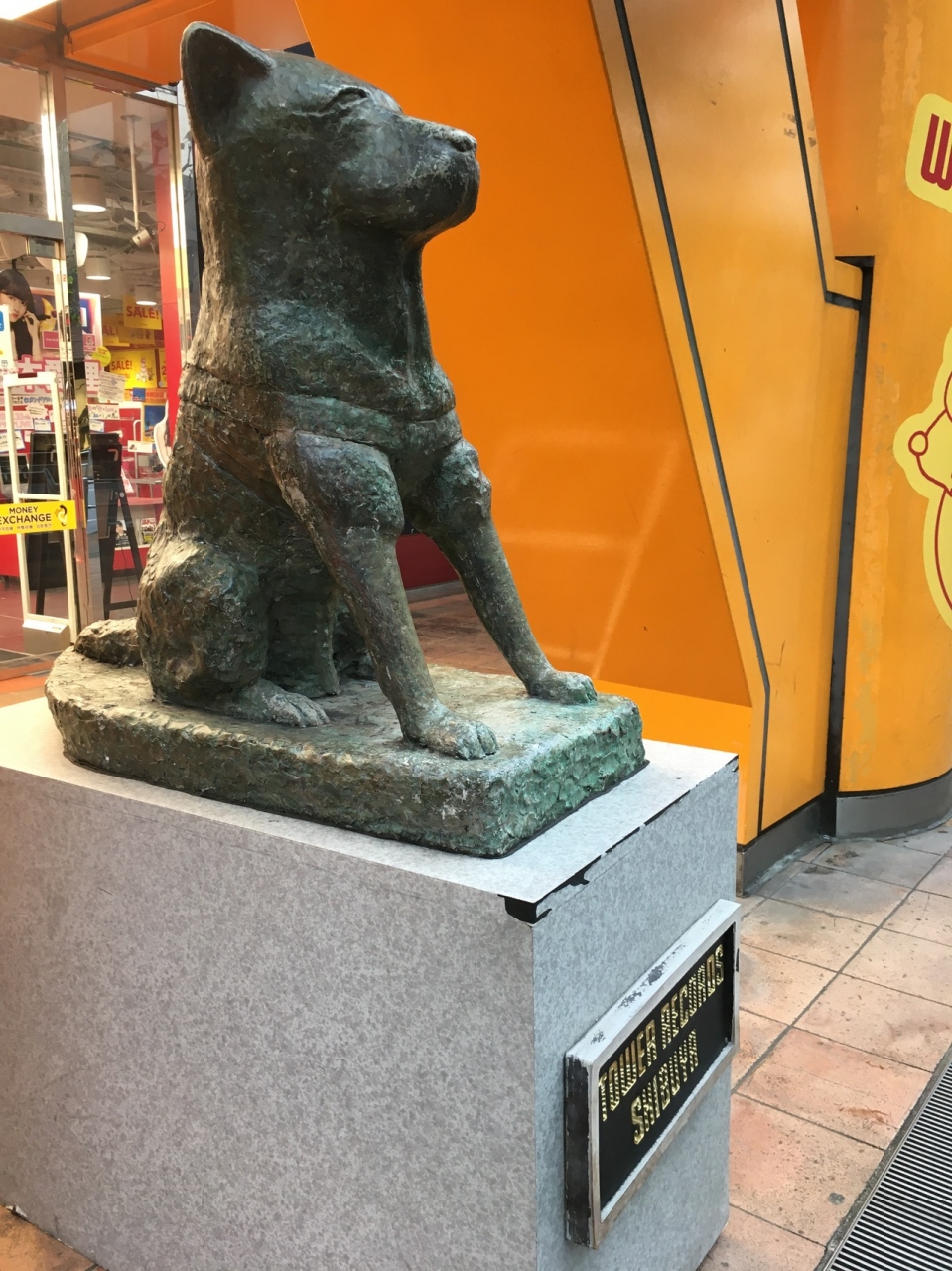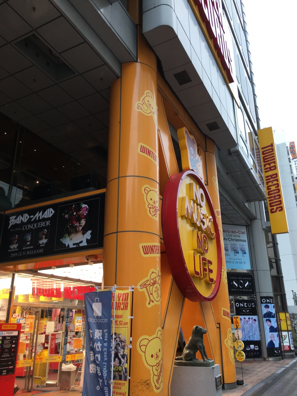 黄色い看板が目立ち、店の出入口には、ハチ公に似た犬の像がありました。店内に入ると話題のアーチストを紹介しているのか、3つのアーチストを紹介していました。8階建てのビルでジャンルごとにフロアーが分かれている音楽のデパートでした。