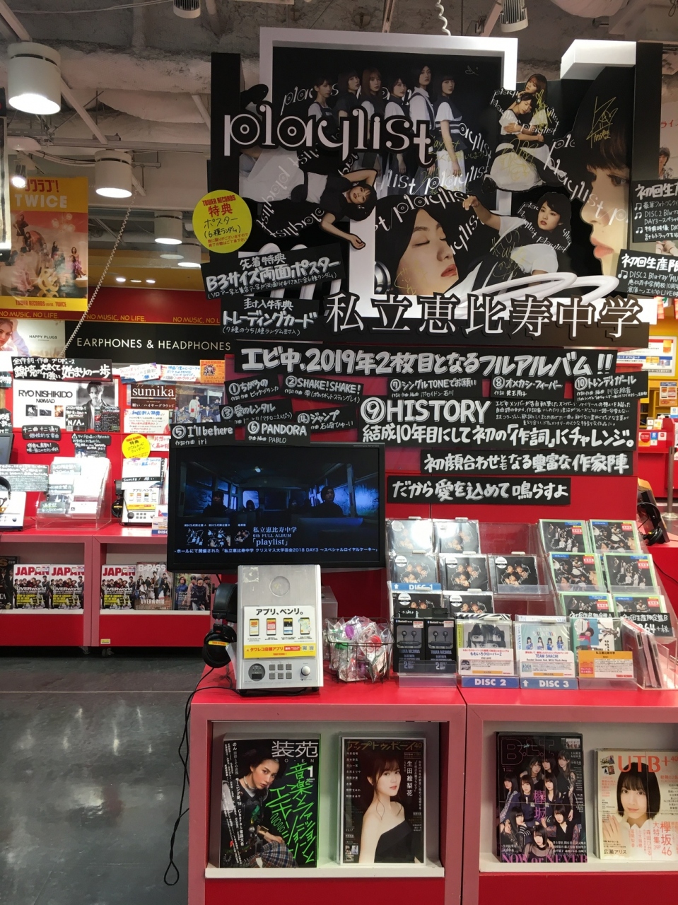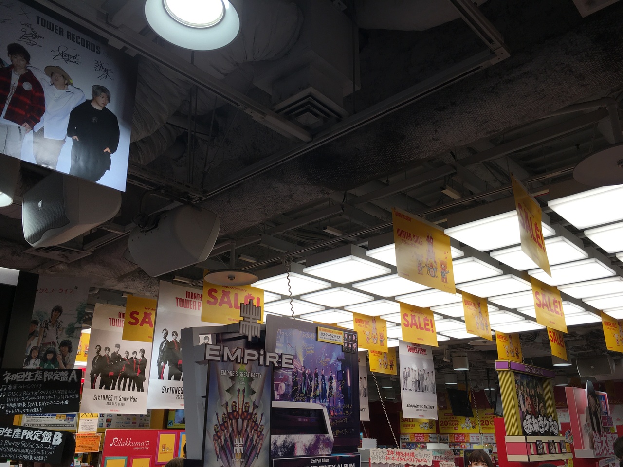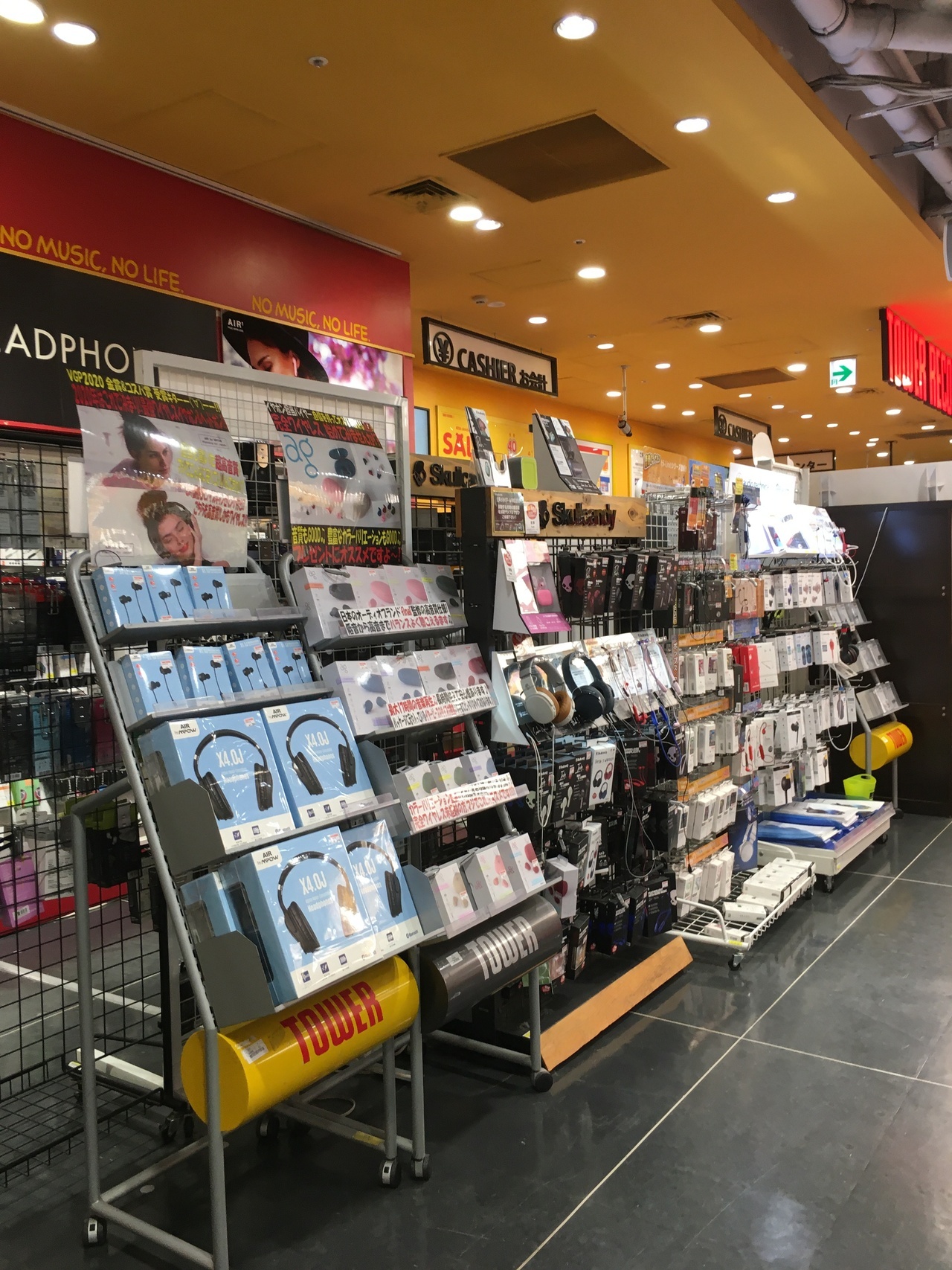 黄色い看板が目立ち、店の出入口には、ハチ公に似た犬の像がありました。店内に入ると話題のアーチストを紹介しているのか、3つのアーチストを紹介していました。8階建てのビルでジャンルごとにフロアーが分かれている音楽のデパートでした。