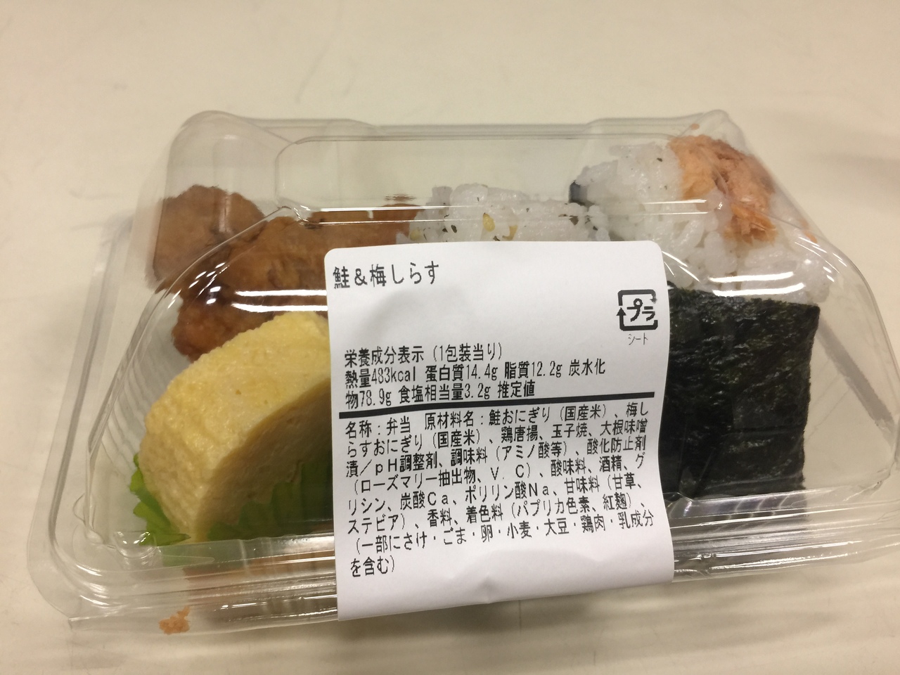 買ったのは鮭と梅しらすおにぎり弁当590円!鮭おにぎりと梅しらすおにぎりにたくあん、鶏唐揚げ、玉子焼きが入ってます。