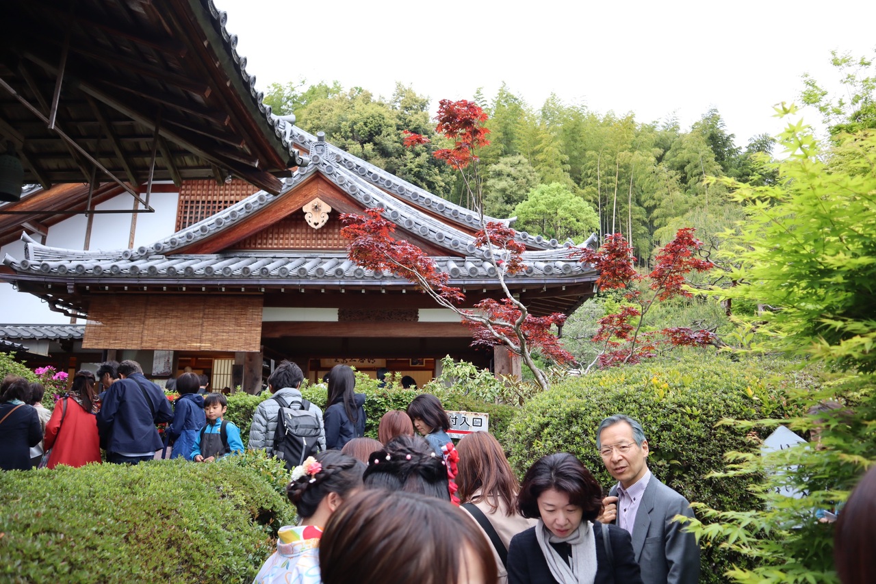 京都からのアクセスはバスで30分以上かかりました。GW中でしたが現地に着いてまさかこんなに混んでいるとは思わずお寺に入るまでの長蛇の列を見て絶句でした。せっかくここまで来たので並びましたが、1時間はかかりました。鈴虫の声を聴きながらお坊さんのお説法を聞きました。お茶とお菓子も頂きました。