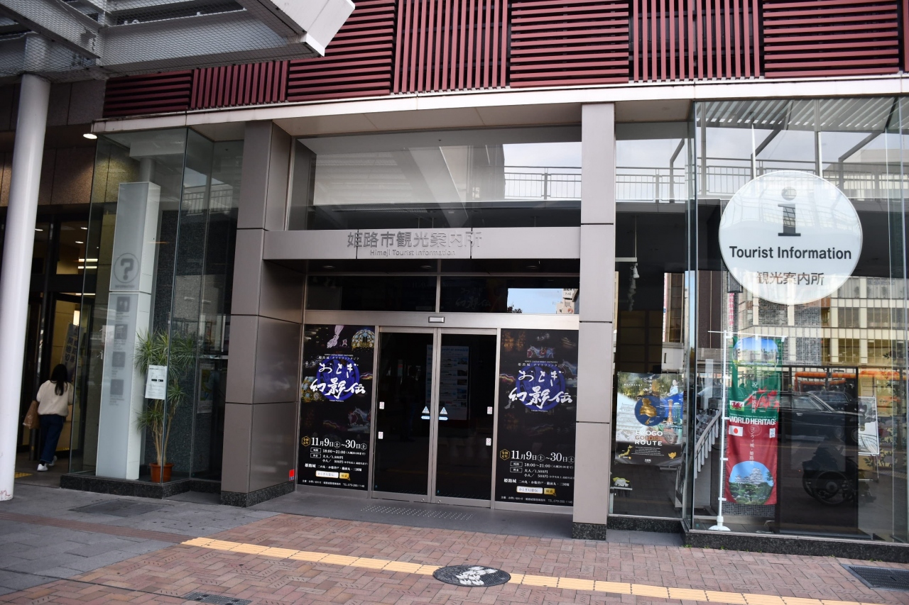 お城の街、姫路駅の構内にある観光案内所です。目立つ場所にありますから、迷う気遣いはないでしょう。お城は正面に見えますが、歩くと二十分ぐらいかかります。お城の他にも、書写山圓教寺や灘の喧嘩祭など、見所があります。