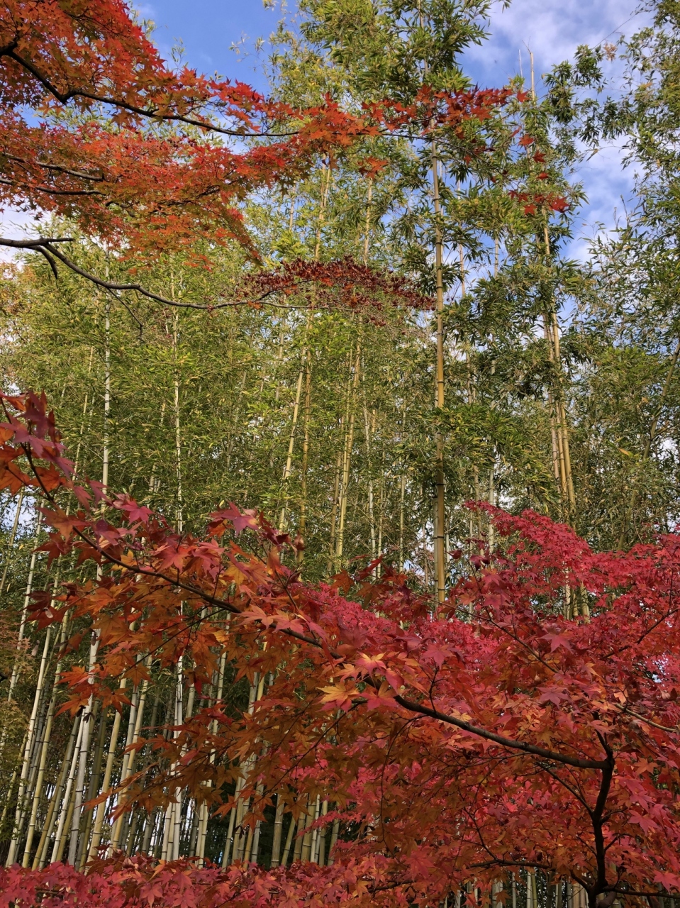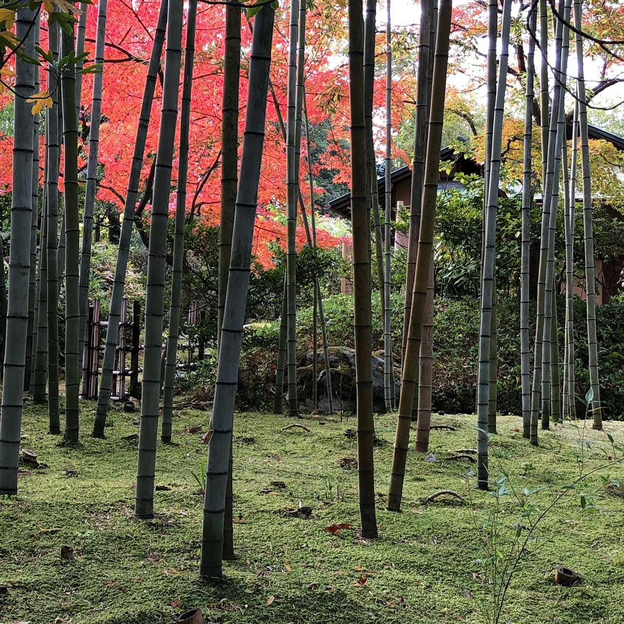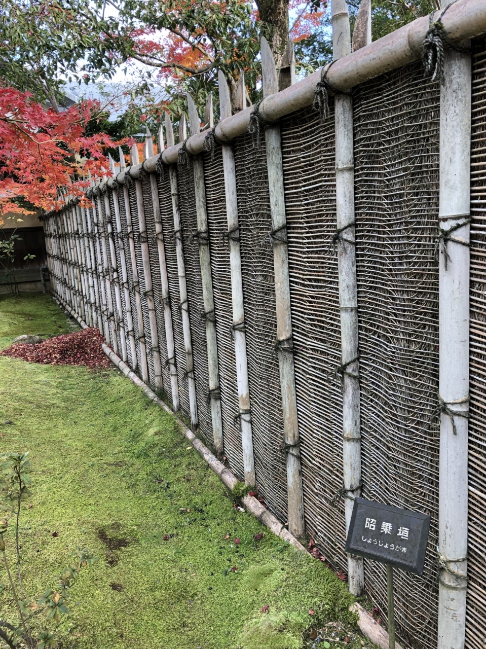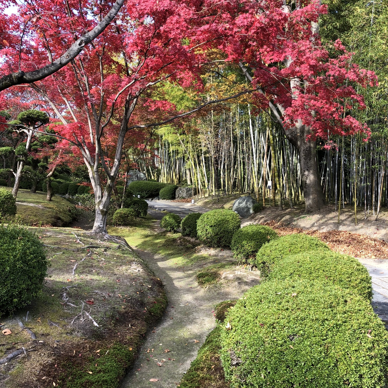 庭園内は八幡の竹、椿、桜と四季を通して楽しめ、私が訪れた紅葉の時期は爽やかな竹の色と華やかな赤と黄色で園内はとても美しいでした。また、園内の竹垣が珍しくもあり工芸美に愕きました。