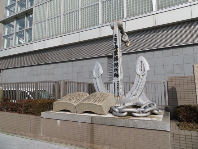 赤い京橋のすぐ近くにあります。神戸電信発祥の地の碑と並んで建っているので、何か関連があるのかもしれません。海軍操練所跡の石碑は普通ですが、その前に大きな鎖のモニュメントがあって、その前に説明を書いたオープンブックの石碑もあり、なかなか凝ってます。