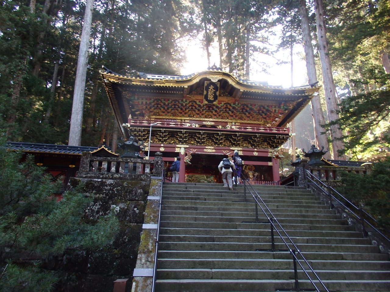 1653年徳川家光の霊廟として大猷院が設けられました。東照宮と異なり仏式の建築群であり、持国天と広目天の二体が正面を守っているところから二天門の名がつきました。日光山内最大の門で、下から門を下から見上げると、正面に後水尾天皇宸筆の扁額「大猷院」がかかり、朱、黒、青、金、緑色等の彩色が施されていて、大きさと見事さに目を見張りますが、陽明門に比べ、朱色部分があるせいか、若干地味な感じがします