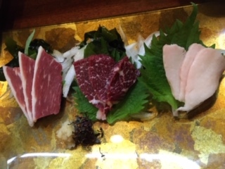 料理は、馬刺し盛り・くじら刺し・牛タン焼き・レバ・せんまい・油かすのハリハリ鍋を注文。