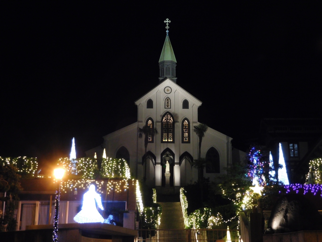 長崎を代表する有名な観光地の一つで、世界遺産にもなっています。折角長崎に来たので、天主堂の中も見学しようかと思いましたが、入場料が1000円もするので、外観の見学のみにしました。グラバー園を見てきた後に再び通りかかると、天主堂がライトアップされてとても幻想的な雰囲気で、多くの人達が写真を撮っていました。