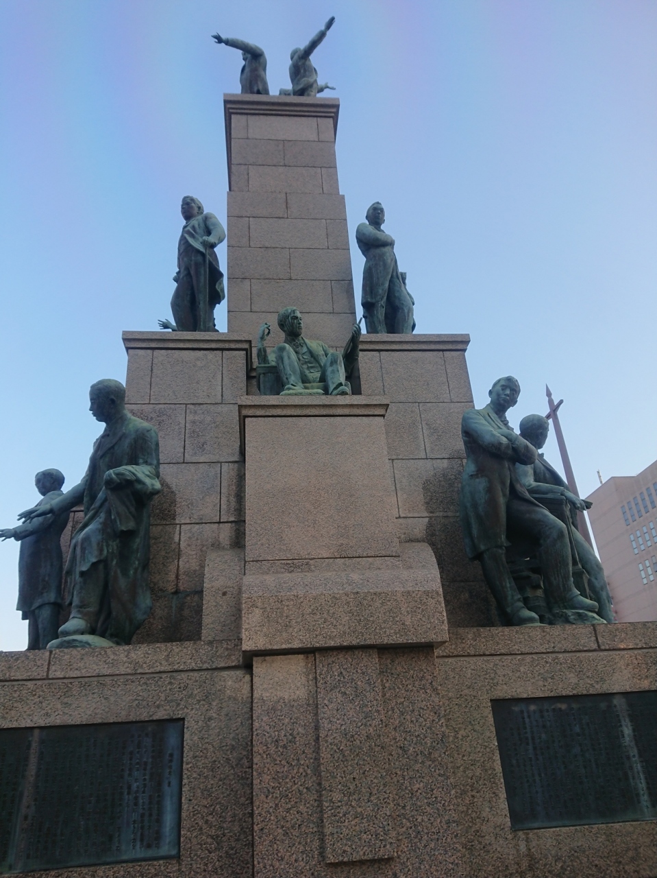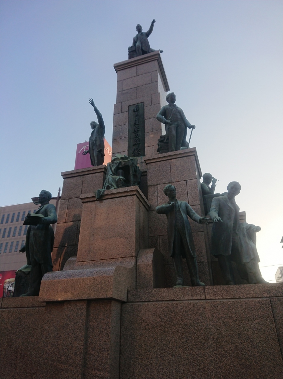 鹿児島中央駅から市電に乗る際に、東口広場に何やらモニュメントがあり、見てきました。こちらの「若き薩摩の群像」は、薩摩藩がイギリスへ派遣した留学生一行の像とのこと。地元の方ならご存知なのかもしれませんが、当方には、馴染みのない名前ばかりでした。