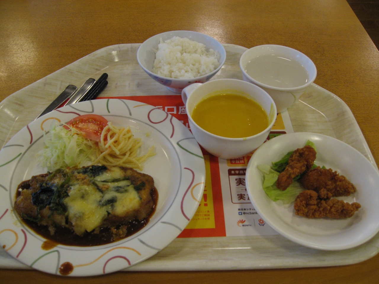 イタリア風ポークグラタン460円(一般価格)を食べました、少し冷めていましたが、パンかごはん スープか味噌汁も選べます。