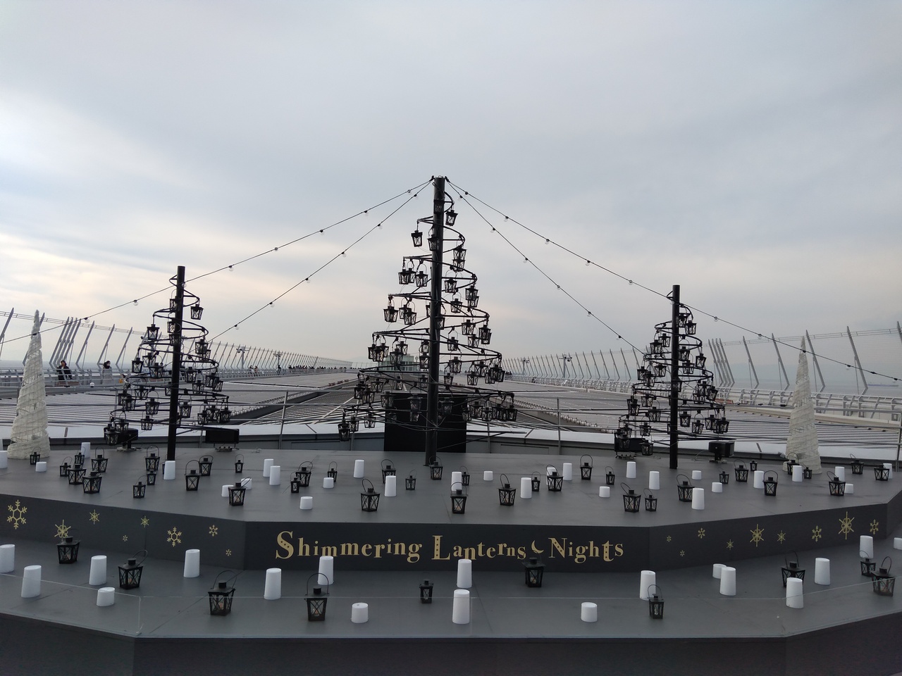 スカイデッキの出入口、正面にランタンが多数ぶら下がったクリスマスツリーがありました。スカイデッキを歩いてみましたが、目立つイルミネーションの装飾は正面以外に見あたらずでした。