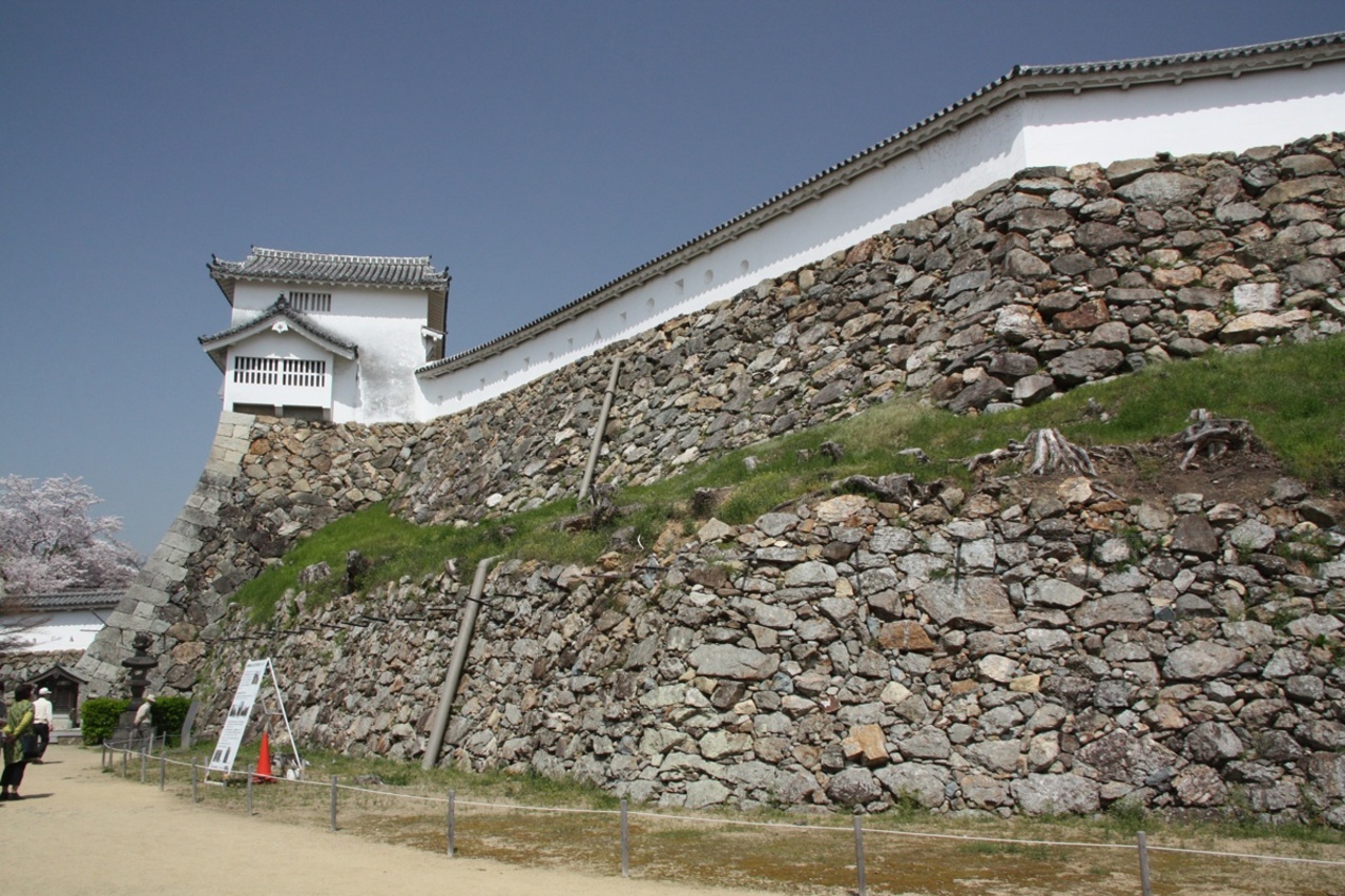 姫路城には多くの曲輪が残り、その曲輪は段々に設置され、本丸に至るまでに渦状に進む必要があります。その様子がよくわかるのがこの場所で、姫路城内で最も古い時期の石垣もこの場所から見ることができます。また一つ上の上山里丸側の勾配のある石垣も見どころです。