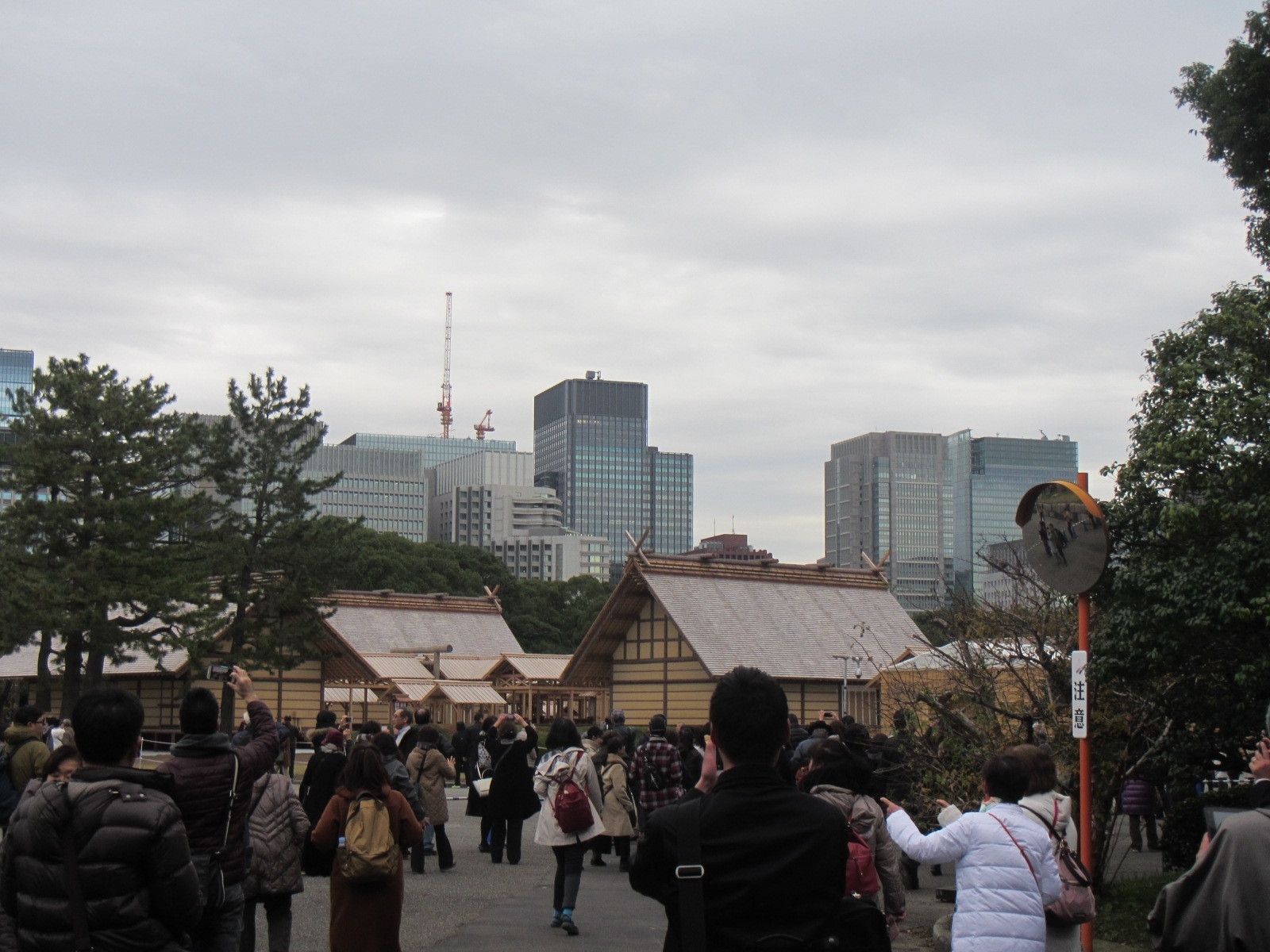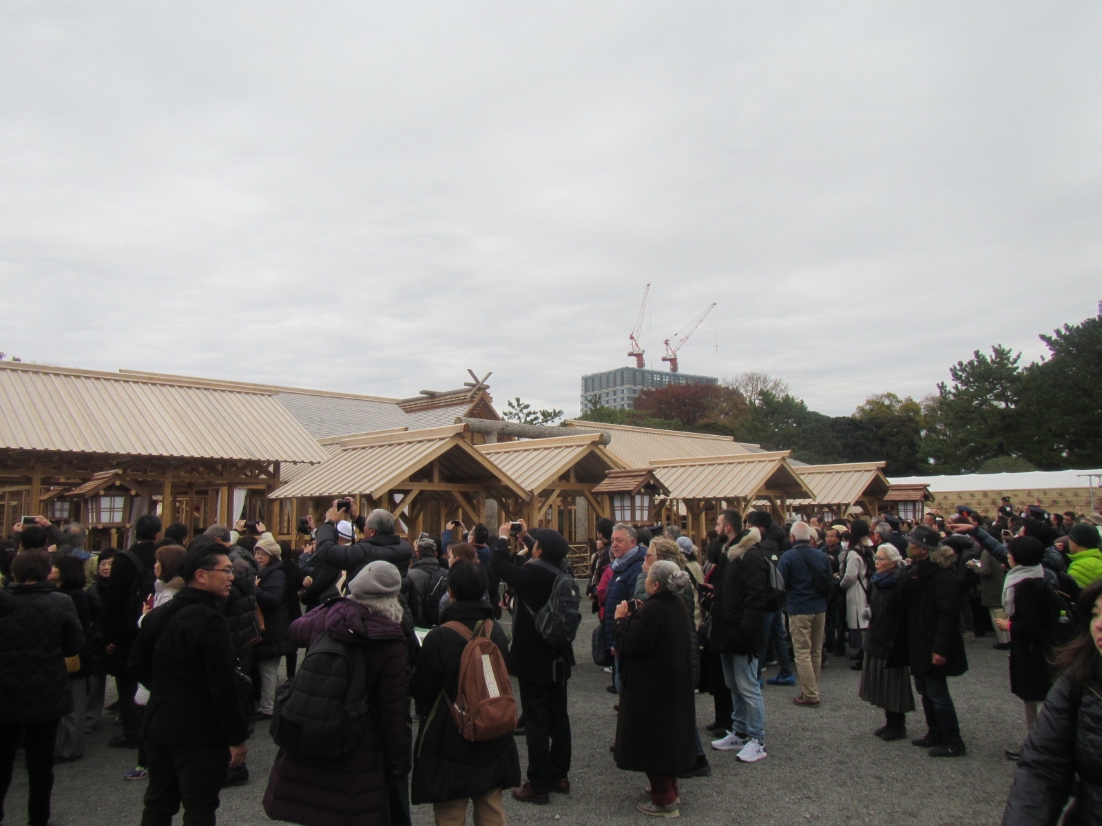 公開時間は9時から16時までで、平日の公開開始後まもなくに訪れると見学の列がストップすることなく流れていましたが、さすがに大嘗宮の正面ではびっちりと人垣ができていました。