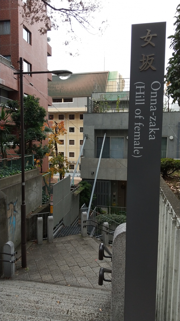 お茶の水から水道橋にかけて散策に行ったときに訪れました。とちの木通りと猿楽通りを結ぶ階段で,近くにある急勾配の男坂と比較すると,傾斜が少し緩やかだったり,途中に一休みできる踊り場があったりと上りやすいかもしれません。女坂についての説明も書いてあるので歴史が良くわかります。