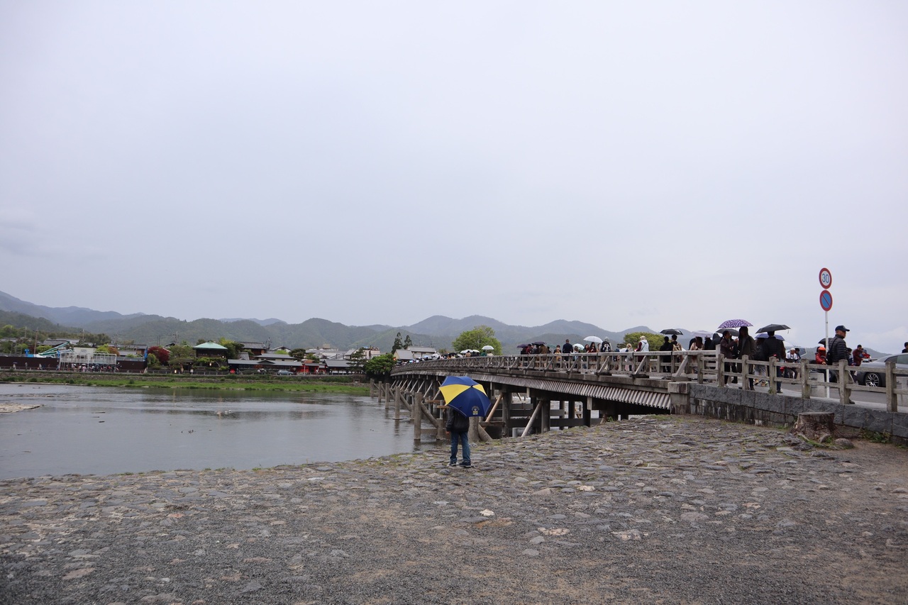 嵐山のシンボルとも言える渡月橋。残念ながらこの日は雨でしたが、しとしと雨に濡れる渡月橋もなかなか風情があります。天候は関係なくこの日も観光客でいっぱいです。雨でも人力車は営業していてさすがだなあと思いました。