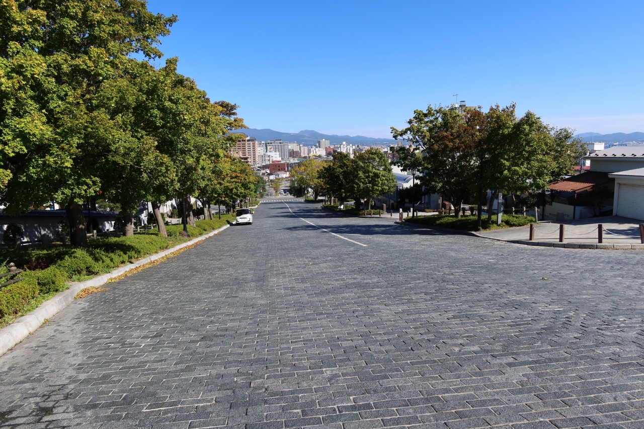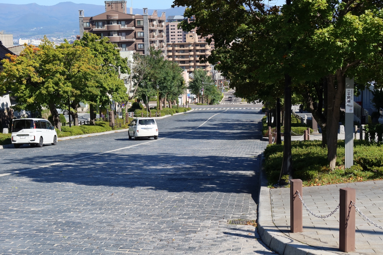 函館の開港通りから函館山山麓に至る一際幅の広い坂道が二十間坂です。名前の通り道幅が二十間あることからこの名がつけられています。坂道の両サイドには街路樹が植えられ、敷き詰められた石畳が美しく、坂沿いには東本願寺函館別院や函館らしい和洋館が並ぶ美しい坂です。