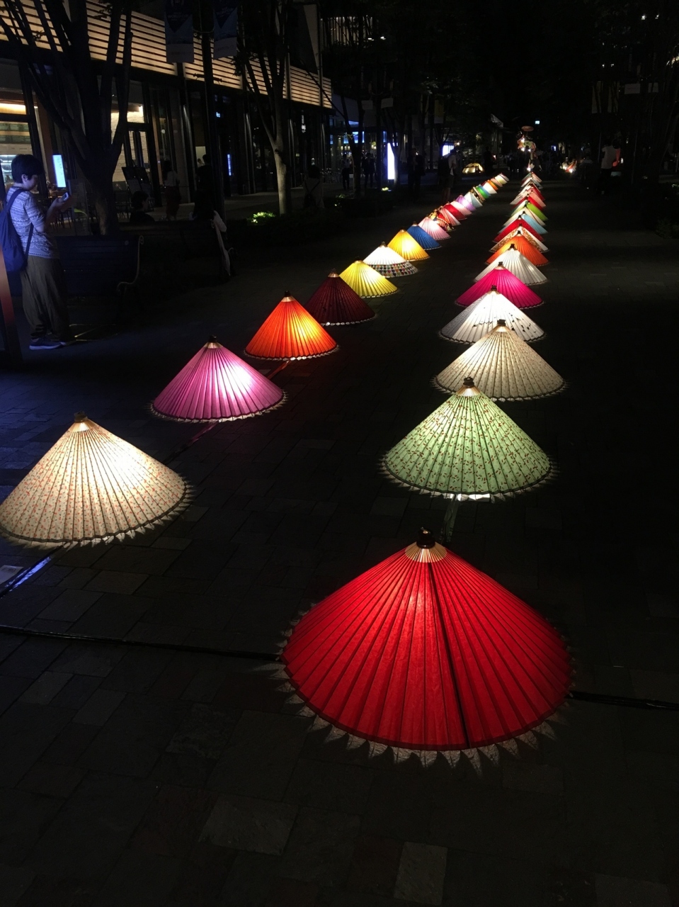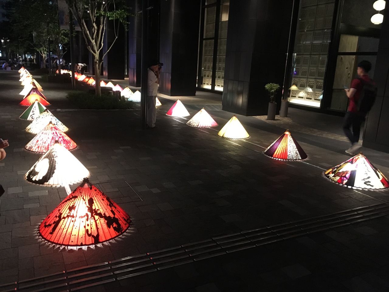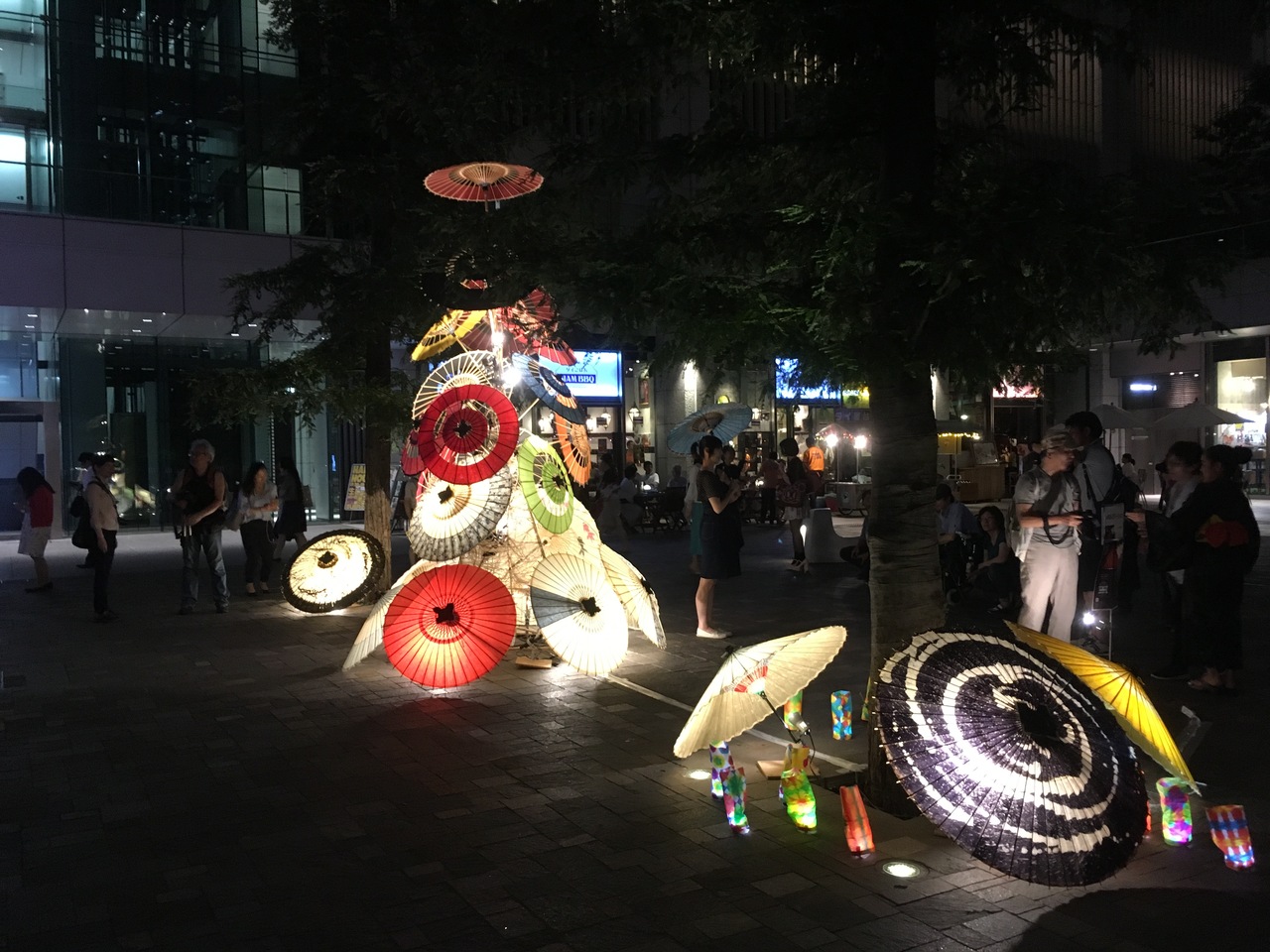オフィス街のど真ん中。オフィスビルと高級ホテルに囲まれた中庭というか、通りには、去年も今年も夏には和傘が飾られる。