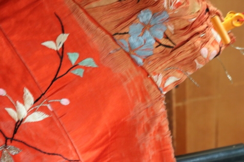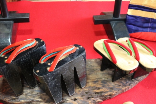 その部屋では、太夫さんの着物が二着飾られていました。青い方は300年超えているとのこと、ゆえにほころびがありました。そばに添えられているのは、有名な七味屋。