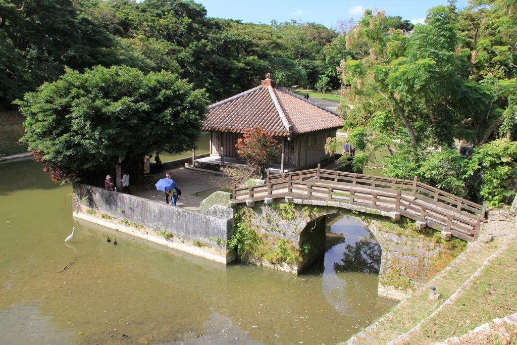 ここは市場公園の中でもちょっと良い撮影スポット。首里城の城壁のすぐ下にある池に石の橋がかかり、中の島にお堂が建っています。