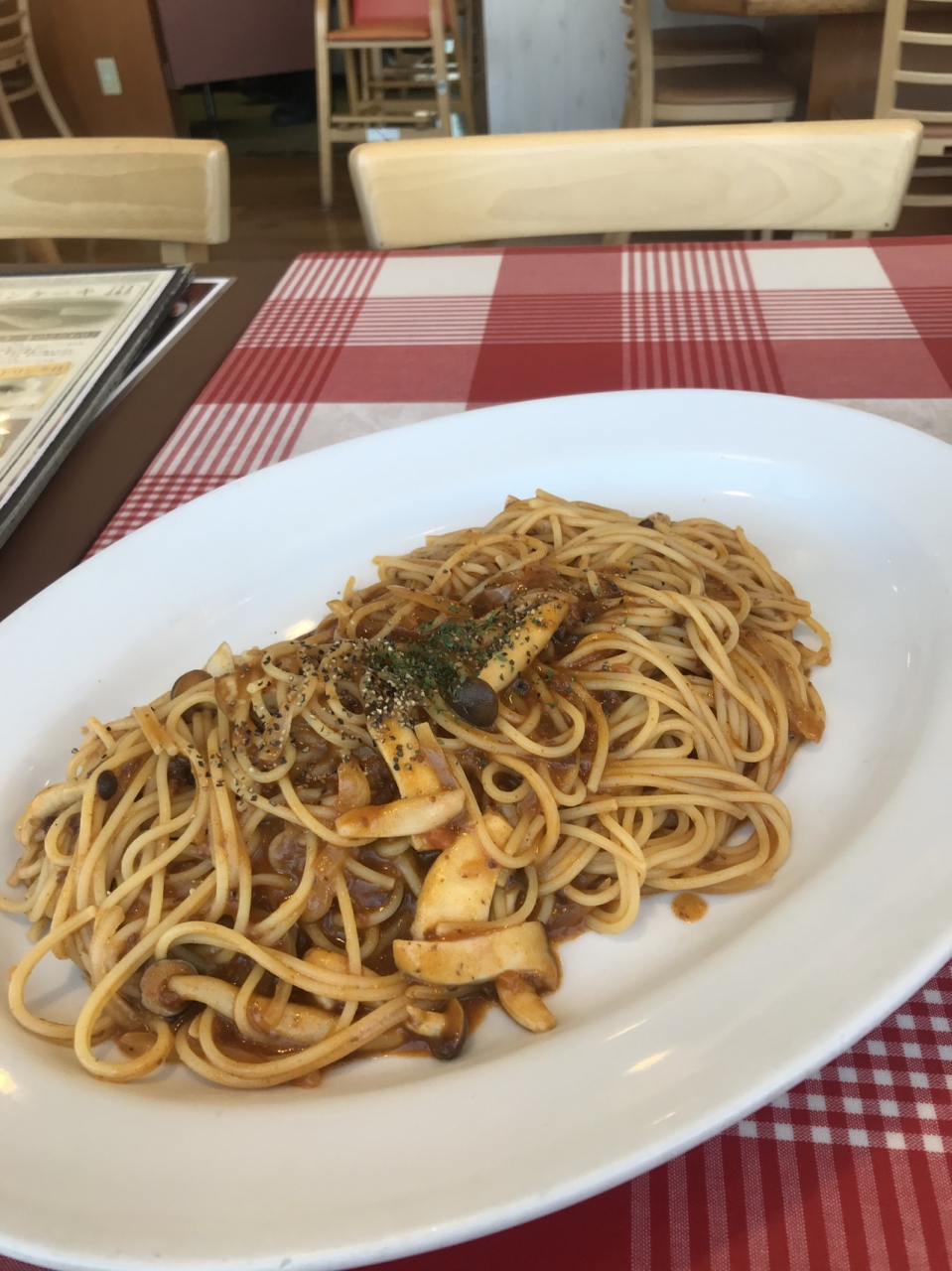 弘前ヨーカ堂のレストランフロアーにある、オーブン亭になります。きのこのミートソースパスタは普通サイズからLLサイズまでが同じ料金になります。お食事メニューを注文すると、ドリンクバーが100円で利用出来ます。