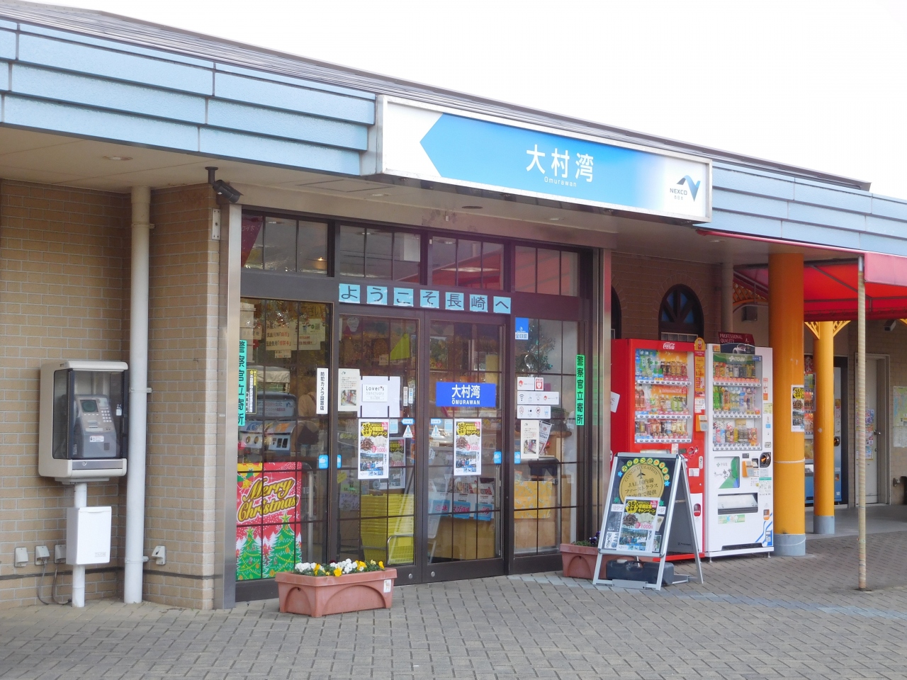 佐賀県から長崎市内へと高速で向かう途中、大村湾PA下り線に休憩で立ち寄りました。コンパクトな売店と奥に食事処のあるシンプルなPAですが、「恋人の聖地」にもなっている為、教会のような休憩スペースや、ハート型のオブジェのついたベンチなどがありました。12月の寒い時期だったので、外で休憩している人は誰もいませんでしたが、気候のいい晴れた日の夕方は人が集まるのかな??と思いました。また、トイレの手洗い場が、ステンドグラスが斜めに設置されていて、斬新なデザインだと思いました。