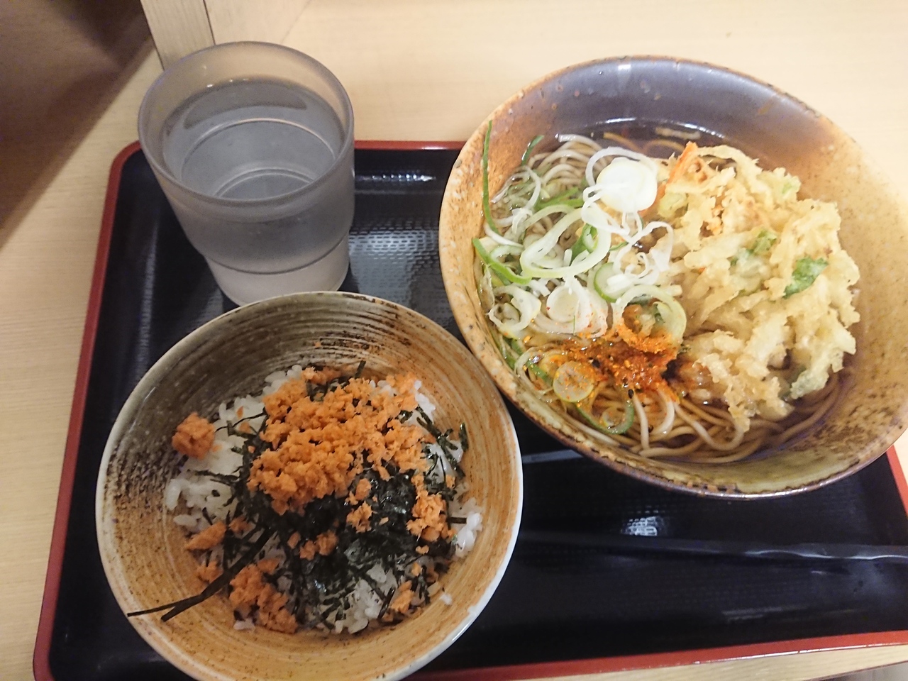 京急品川駅から羽田空港線へ乗り換える途中で、ちょうどお昼時。手早くランチを済ませるため、立ち食い蕎麦へ入店。サラリーマンでなかなかの盛況で、食券を渡すのにも若干の列をなしてます。が、回転率はよく、すばやくかき揚げそば&のり鮭ごはんが着丼。お蕎麦は甘めの出汁にかき揚げがマッチし、安心のレベル。150円ののり鮭ご飯はきざみ海苔と鮭フレークをまぶしただけなんですが、ここで頂くとたいへん美味。今度、家でもやってみようと思います。早くて安い、味も無難で、言うことなし。
