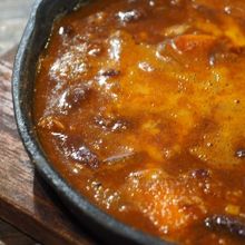 挽き肉と、トマトと、豆をスパイスと共に煮込んだものが、熱々の鉄板皿で提供される。