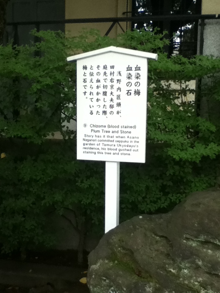 血染めの梅と血染めの石は山門から四十七士墓所へ行く途中にある。お勧めの点は、浅野内匠頭が田村右京大夫邸の庭先で切腹した際に、その血がこの梅と石にかかったと言われていること、この梅と石の横に説明板があり分かりやすい事である。訪問時の感想は、梅の木は大きく育ち石は大きなものであり、この血染めの梅と血染めの石を見ることができ訪問して良かった。