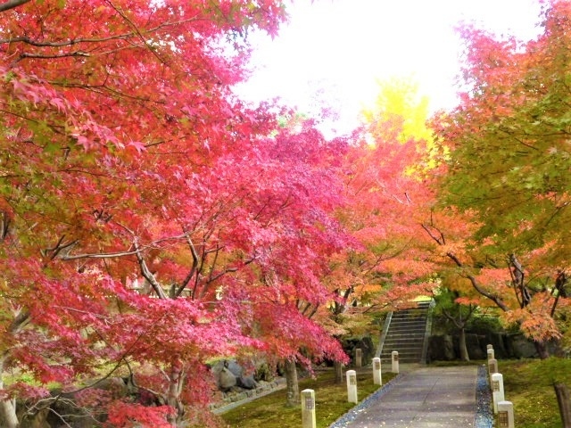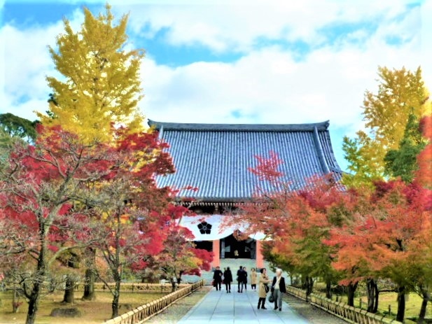 八坂神社/円山公園から市バスに乗って(祇園→東山七条)[智積院]に;`紅葉が見ごろ`と聞いていたので。東大路通り/七条通りの丁字路に`総門`と別の`拝観受付所;総本山智積院の門`がありました(八坂神社も東大路通り/四条通りの`丁字路`に西楼門が!)。門をくぐった参道から一番大事な金堂;ご本尊 金剛界大日如来が拝めるのは!!