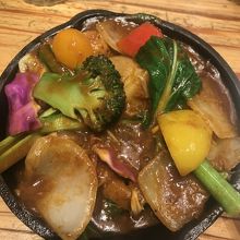 1番オーソドックスな野菜のカレーにしました。本当に沢山の野菜が食べられます。ご飯の量は普通か大盛り選べましたが、大盛りでもぜんぜん多くなくて男の人はきっと足りないかな?店は狭く、向かい合わせのカウンター形式になっていますが、向かい側との仕切りがないのでちょっと気まづいです。