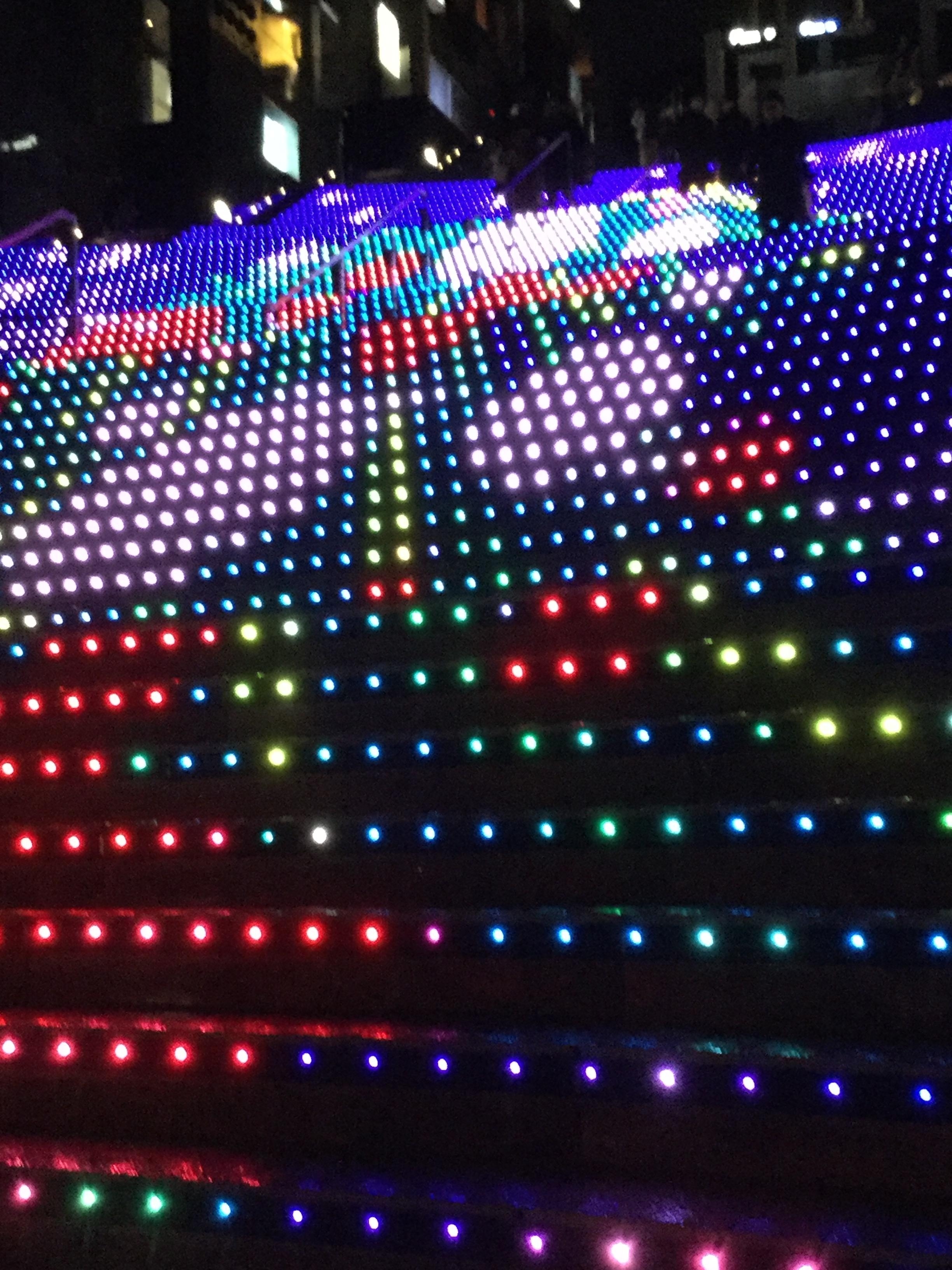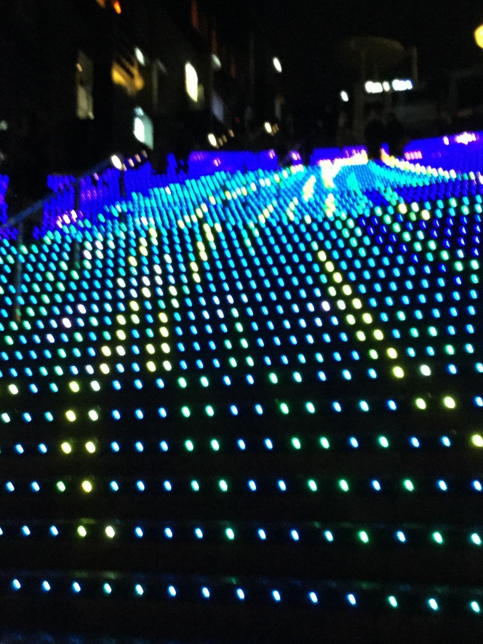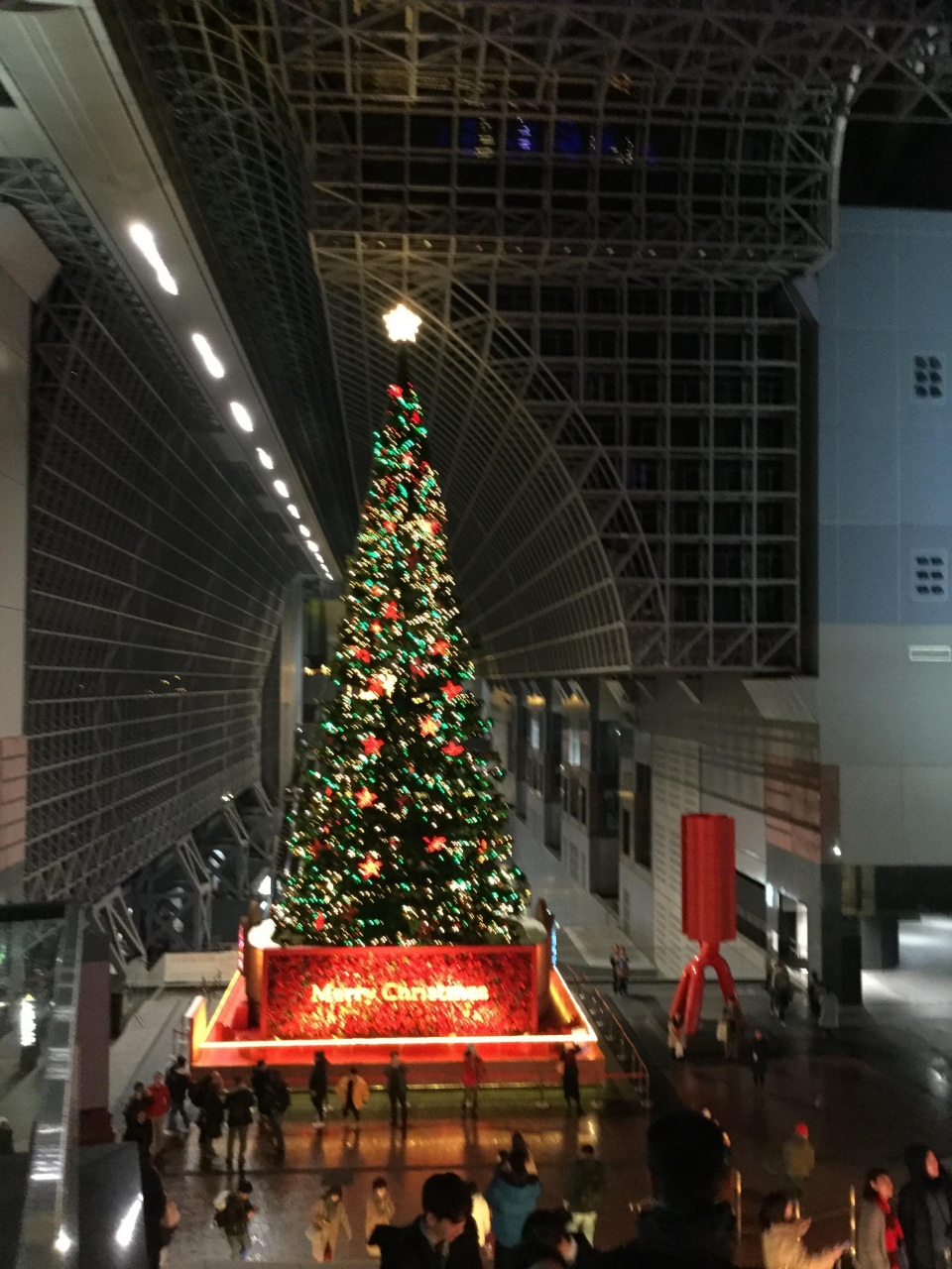 京都の駅ビル、伊勢丹の横にある大階段のある広場に大きなクリスマスツリーが点灯されて、ちかくに用事があって行く事が出来ました。大きなツリーは今年は下の方に家の窓があって温かさが伝わって来ました。ツリーの上に大階段があって、クリスマスプロジェクションマッピングもされていました。大階段の途中くらいの高さからツリーの全体が写真を撮れて、その後ろに広がる向かい側のホテルグランピア京都の眩しいイルミネーションも見えて、辺り一面に静かにしっとりとクリスマスの空気に溢れています。京都に太秦映画村があって、映画の街にちなんでこの大階段が出来たのかなとふと思ったりしました。古くて新しい、やっぱり古い、京都は深いです。
