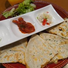トルティーヤに、牛の挽き肉や、チーズを挟んで焼き上げたものが、4ピース提供される。