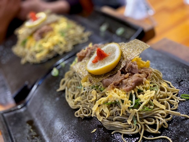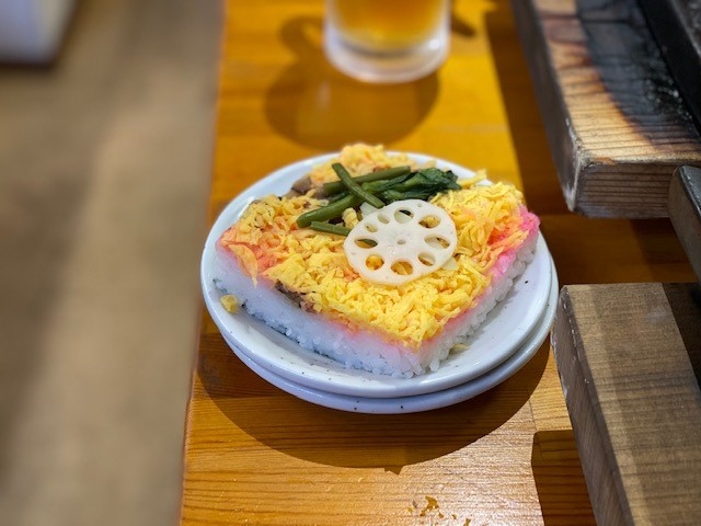 瓦そばと岩国寿司、両方いただけます。入口のすぐ左に券売機があり、そこで券を購入します。甘めのつゆでいただく瓦そばですが、レモンの酸味と相まって、ちょうどいい感じでした。瓦そばを一人前ずつオーダーしたので、岩国寿司は1つをシェアしました。それほど大きくない岩国寿司ですが、押してあるせいか結構ボリュームあります。