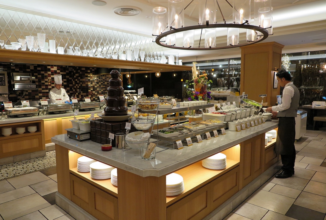 レストラン予約サイトにあったプラン、お酒のフリーフロー付のディナーブッフェ(5800円)を楽しんで来ました。着席するとスタッフが上着を受け取ってくれたので、「ハンガーラックあるのかな?」と思いましたが、椅子の背に掛けただけでした(笑)。ただ、知らんぷりするホテルが多い中、「気にしているんですよ」という態度は○です。さて料理の種類は迷うほどではありませんが、質の高さは感じられました。ライブキッチンでのローストビーフは集めにカットされていましたし、注文をすると調理される“秋鮭と椎茸紙鍋仕立てバター風味”も美味しいものでした。冷蔵ケースに入った井村屋のアイスバーも初めて目にしました。お酒はバーコーナーに行って注文するのも、ちょっとイベント性がありました。楽しかったですよ。